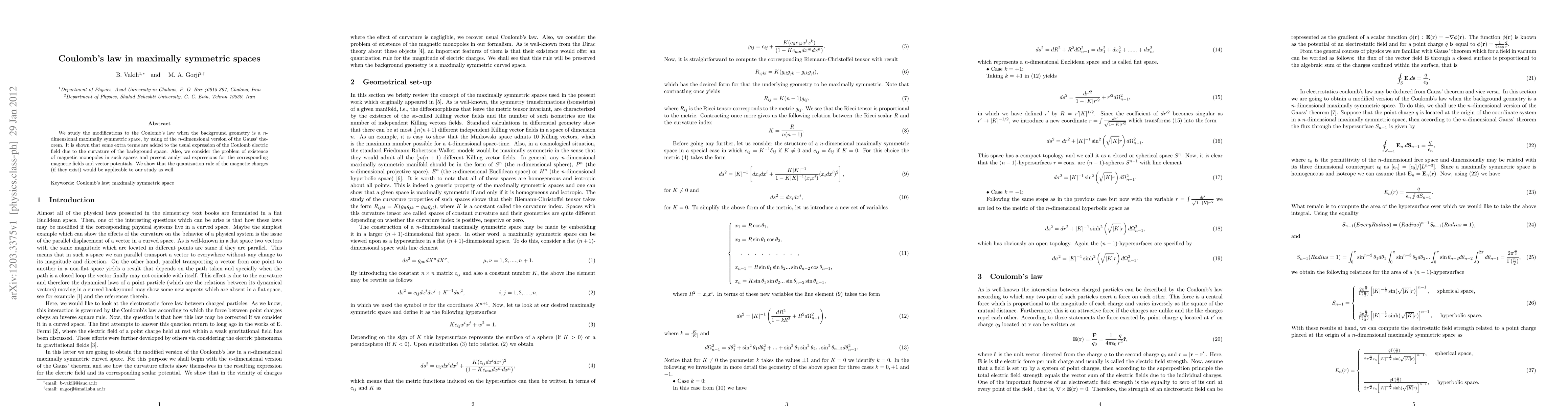 This paper examines how Coulomb's law is modified in $n$-dimensional maximally symmetric spaces, revealing additional terms due to space curvature. It also investigates the existence of magnetic monopoles and provides analytical expressions for their magnetic fields and vector potentials, along with the quantization rule for magnetic charges.