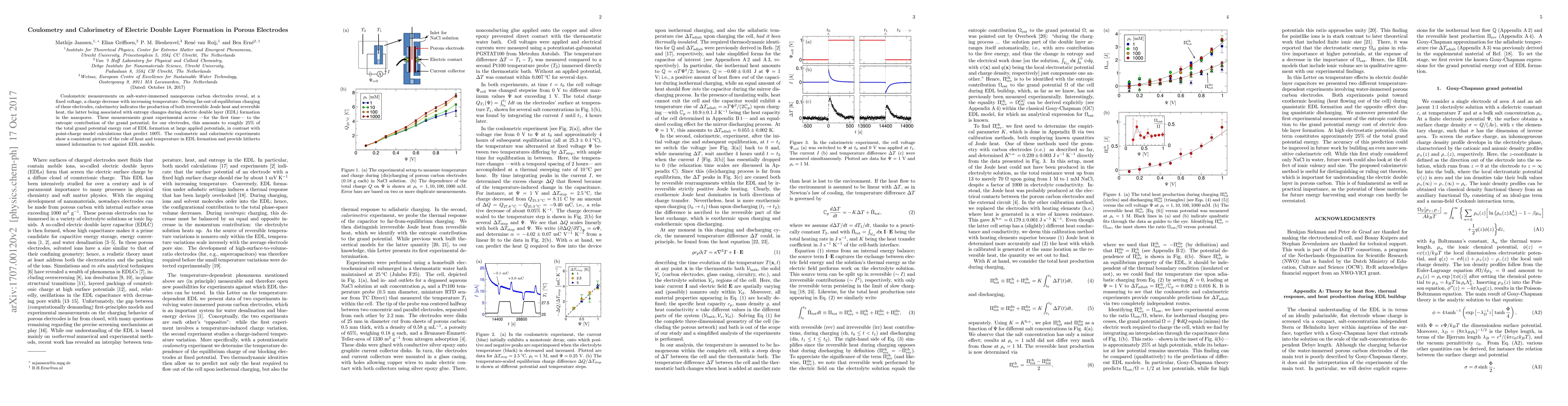Coulometric measurements on salt-water-immersed nanoporous carbon electrodes reveal, at a fixed voltage, a charge decrease with increasing temperature. During far-out-of-equilibrium charging of these electrodes, calorimetry indicates the production of both irreversible Joule heat and reversible heat, the latter being associated with entropy changes during electric double layer (EDL) formation in the nanopores. These measurements grant experimental access --for the first time-- to the entropic contribution of the grand potential; for our electrodes, this amounts to roughly 25% of the total grand potential energy cost of EDL formation at large applied potentials, in contrast with point-charge model calculations that predict 100%. The coulometric and calorimetric experiments show a consistent picture of the role of heat and temperature in EDL formation and provide hitherto unused information to test against EDL models.