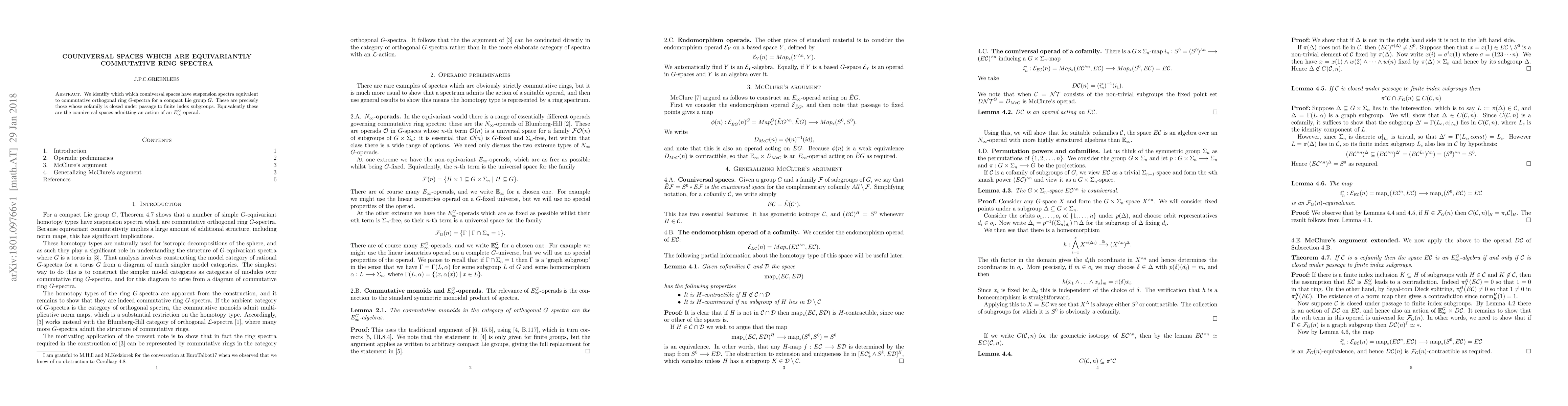 The note identifies which which couniversal spaces have suspension spectra equivalent to commutative orthogonal ring G-spectra for a compact Lie group G. These are precisely those whose cofamily is closed under passage to finite index subgroups. Equivalently these are the couniversal spaces admitting an action of an equivariant E infinity operad.