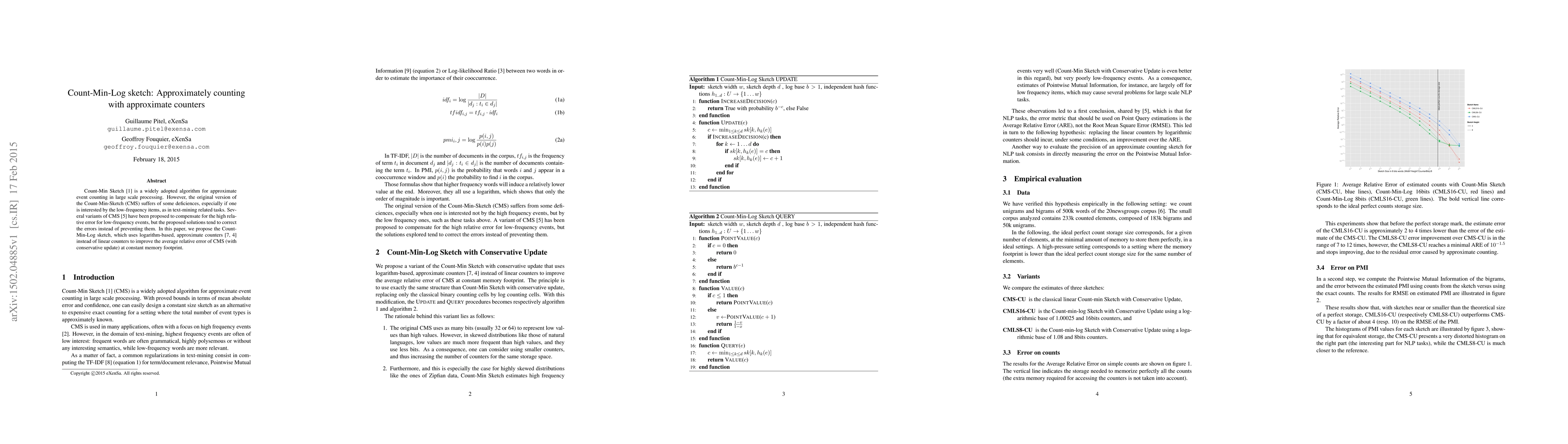 Count-Min Sketch is a widely adopted algorithm for approximate event counting in large scale processing. However, the original version of the Count-Min-Sketch (CMS) suffers of some deficiences, especially if one is interested by the low-frequency items, such as in text-mining related tasks. Several variants of CMS have been proposed to compensate for the high relative error for low-frequency events, but the proposed solutions tend to correct the errors instead of preventing them. In this paper, we propose the Count-Min-Log sketch, which uses logarithm-based, approximate counters instead of linear counters to improve the average relative error of CMS at constant memory footprint.