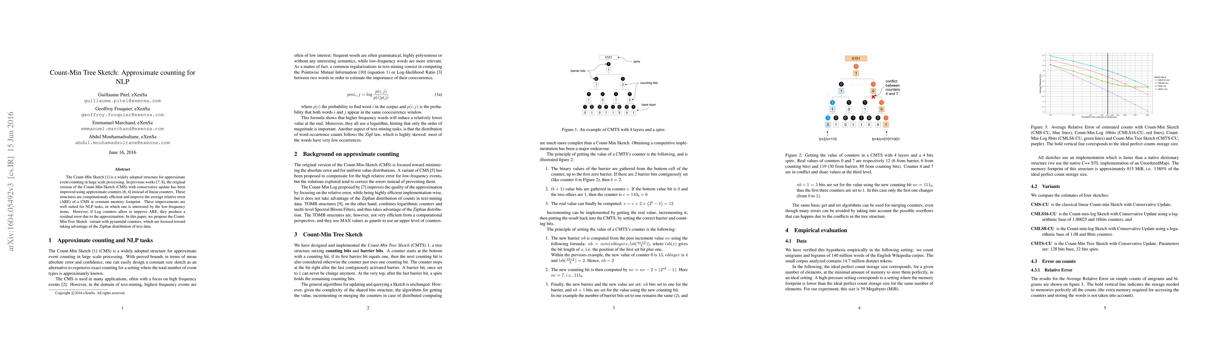 The Count-Min Sketch is a widely adopted structure for approximate event counting in large scale processing. In a previous work we improved the original version of the Count-Min-Sketch (CMS) with conservative update using approximate counters instead of linear counters. These structures are computationaly efficient and improve the average relative error (ARE) of a CMS at constant memory footprint. These improvements are well suited for NLP tasks, in which one is interested by the low-frequency items. However, if Log counters allow to improve ARE, they produce a residual error due to the approximation. In this paper, we propose the Count-Min Tree Sketch (Copyright 2016 eXenSa. All rights reserved) variant with pyramidal counters, which are focused toward taking advantage of the Zipfian distribution of text data.