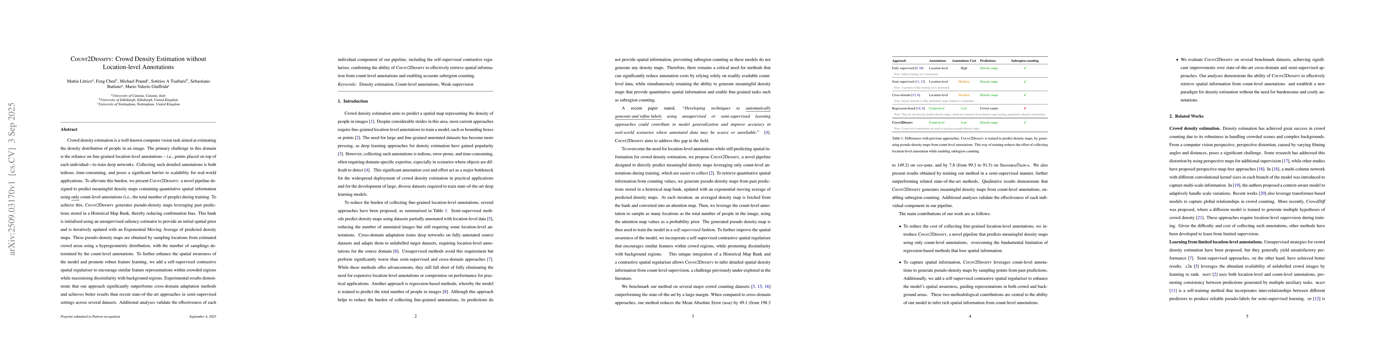 Crowd density estimation is a well-known computer vision task aimed at estimating the density distribution of people in an image. The main challenge in this domain is the reliance on fine-grained location-level annotations, (i.e. points placed on top of each individual) to train deep networks. Collecting such detailed annotations is both tedious, time-consuming, and poses a significant barrier to scalability for real-world applications. To alleviate this burden, we present Count2Density: a novel pipeline designed to predict meaningful density maps containing quantitative spatial information using only count-level annotations (i.e., total number of people) during training. To achieve this, Count2Density generates pseudo-density maps leveraging past predictions stored in a Historical Map Bank, thereby reducing confirmation bias. This bank is initialised using an unsupervised saliency estimator to provide an initial spatial prior and is iteratively updated with an EMA of predicted density maps. These pseudo-density maps are obtained by sampling locations from estimated crowd areas using a hypergeometric distribution, with the number of samplings determined by the count-level annotations. To further enhance the spatial awareness of the model, we add a self-supervised contrastive spatial regulariser to encourage similar feature representations within crowded regions while maximising dissimilarity with background regions. Experimental results demonstrate that our approach significantly outperforms cross-domain adaptation methods and achieves better results than recent state-of-the-art approaches in semi-supervised settings across several datasets. Additional analyses validate the effectiveness of each individual component of our pipeline, confirming the ability of Count2Density to effectively retrieve spatial information from count-level annotations and enabling accurate subregion counting.