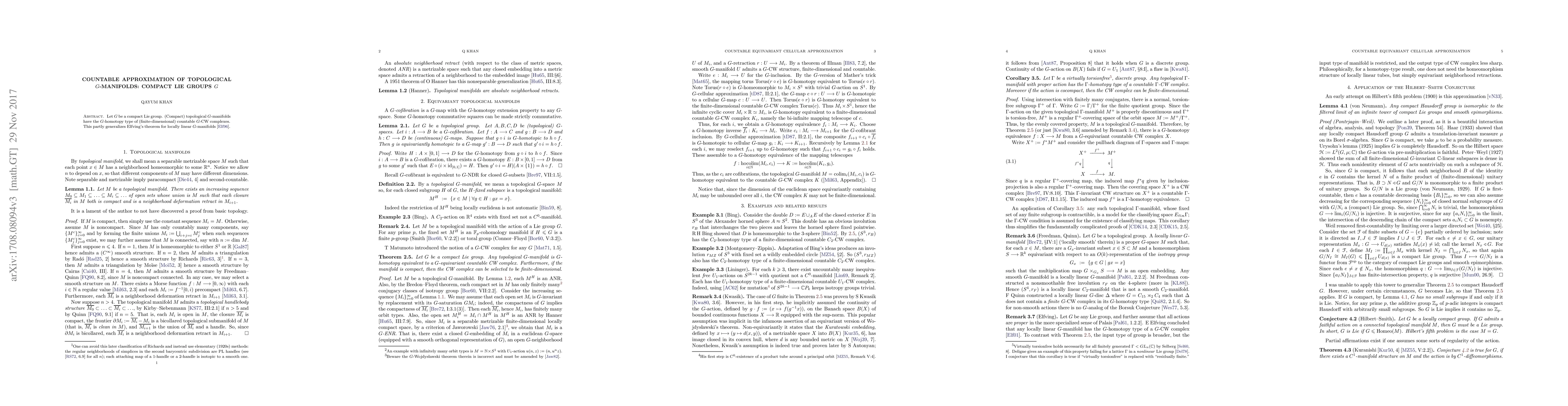 This paper explores the countable approximation of topological $G$-manifolds for compact Lie groups $G$, showing they have the $G$-homotopy type of countable $G$-CW complexes. This extends Elfving's theorem to a broader class of compact Lie groups.