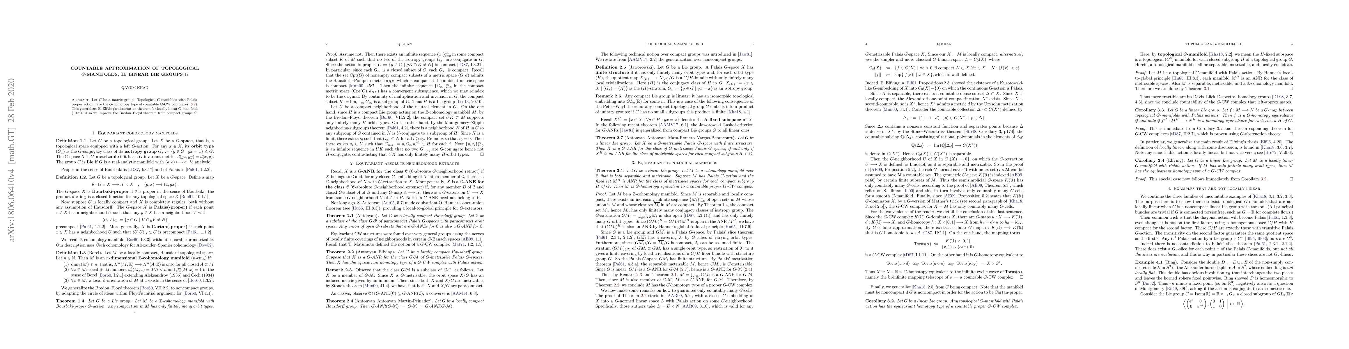 This paper generalizes E Elfving's theorem on countable approximation for locally linear $G$-manifolds, showing that topological $G$-manifolds with Palais-proper action have the $G$-homotopy type of countable $G$-CW complexes. It also extends the Bredon--Floyd theorem for linear Lie groups $G$.