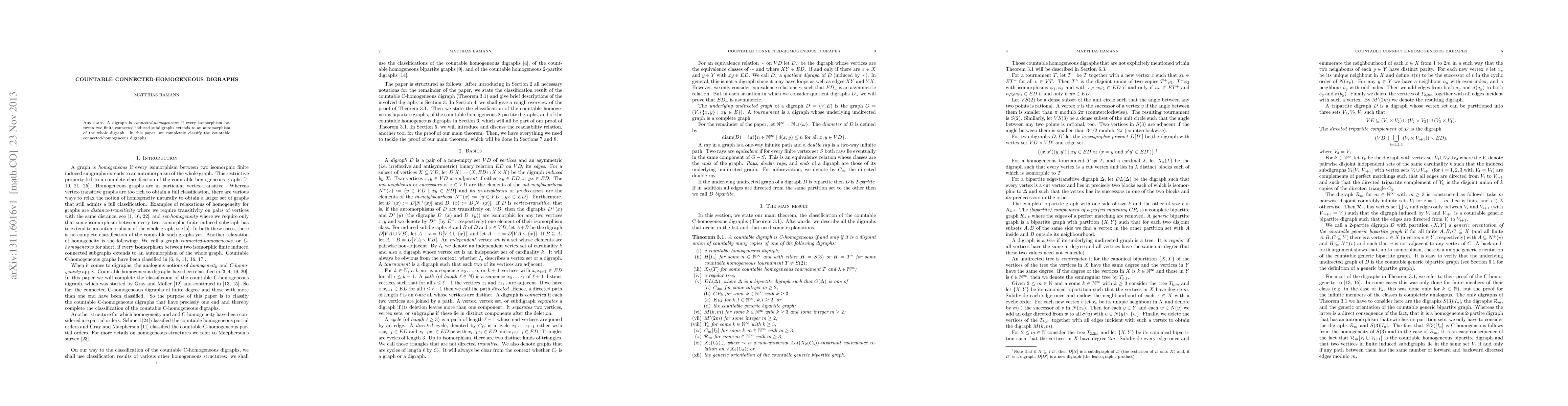 This paper classifies all countable connected-homogeneous digraphs, establishing that every isomorphism between finite connected induced subgraphs extends to an automorphism of the entire digraph. The complete characterization provides a foundational understanding of these structures.