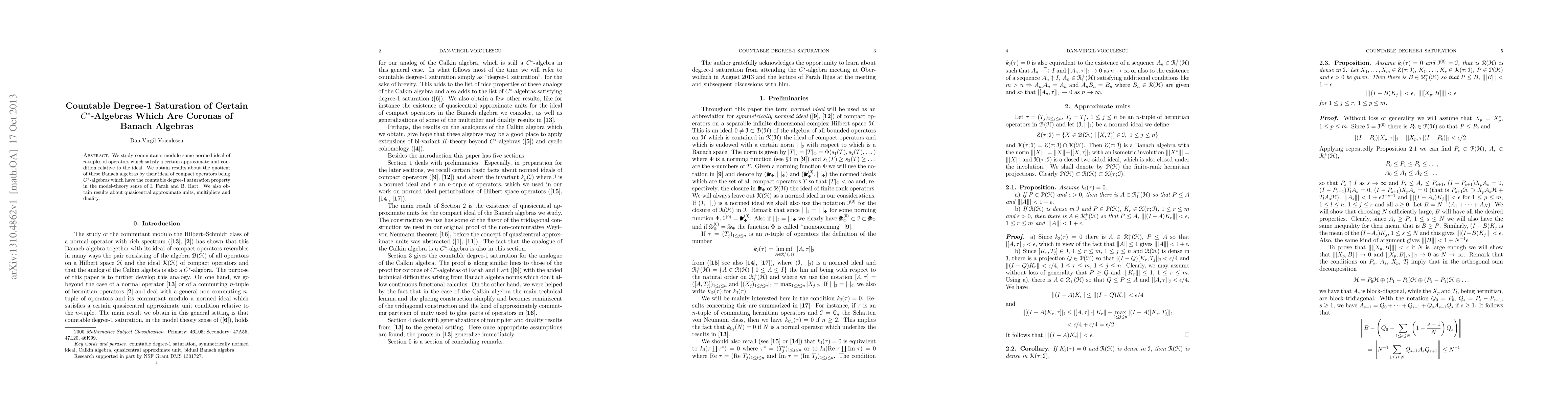 We study commutants modulo some normed ideal of n-tuples of operators which satisfy a certain approximate unit condition relative to the ideal. We obtain results about the quotient of these Banach algebras by their ideal of compact operators being C*-algebras which have the countable degree-1 saturation property in the model-theory sense of I. Farah and B. Hart. We also obtain results about quasicentral approximate units, multipliers and duality.