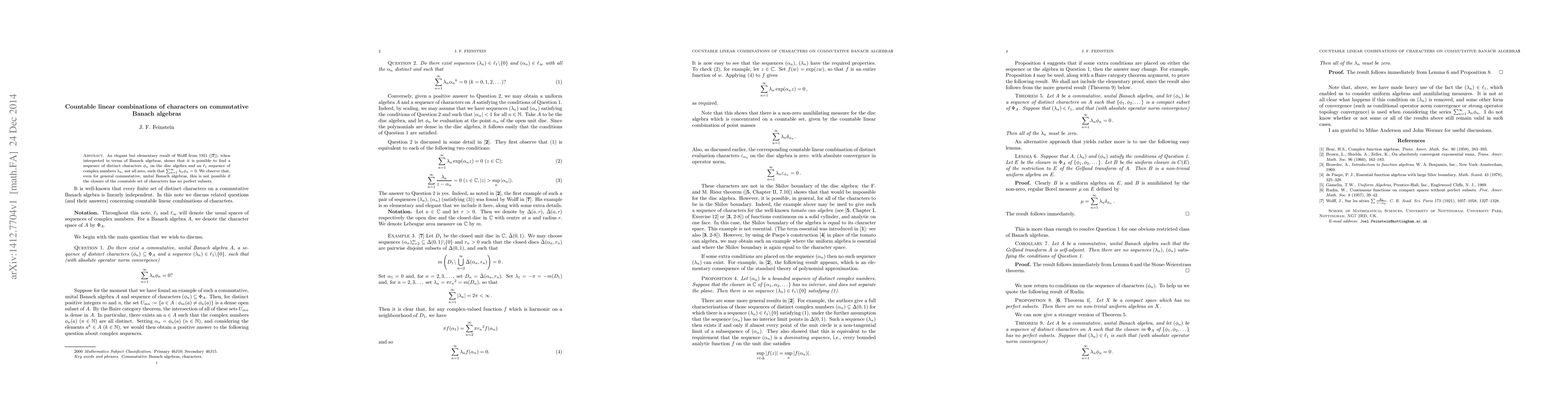 An elegant but elementary result of Wolff from 1921, when interpreted in terms of Banach algebras, shows that it is possible to find a sequence of distinct characters $\phi_n$ on the disc algebra and an $\ell_1$ sequence of complex numbers $\lambda_n$, not all zero, such that $\sum_{n=1}^\infty \lambda_n \phi_n =0.$ We observe that, even for general commutative, unital Banach algebras, this is not possible if the closure of the countable set of characters has no perfect subsets.