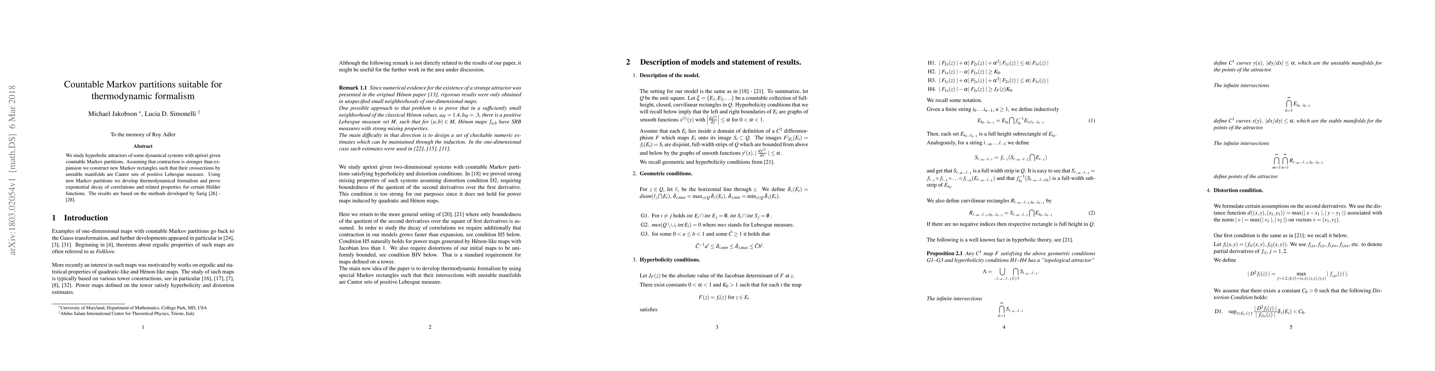 We study hyperbolic attractors of some dynamical systems with apriori given countable Markov partitions. Assuming that contraction is stronger than expansion we construct new Markov rectangles such that their crossections by unstable manifolds are Cantor sets of positive Lebesgue measure. Using new Markov partitions we develop thermodynamical formalism and prove exponential decay of correlations and related properties for certain H\"older functions. The results are based on the methods developed by Sarig.