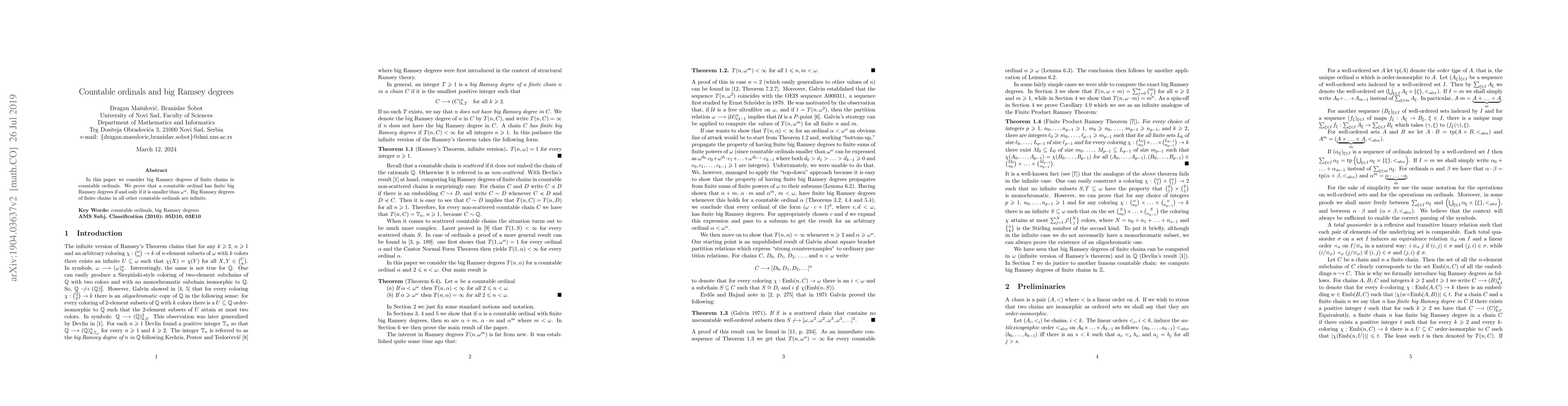 This paper investigates the big Ramsey degrees of finite chains within countable ordinals, proving that a countable ordinal has finite big Ramsey degrees if and only if it is less than $\omega^\omega$, while all other countable ordinals exhibit infinite big Ramsey degrees.