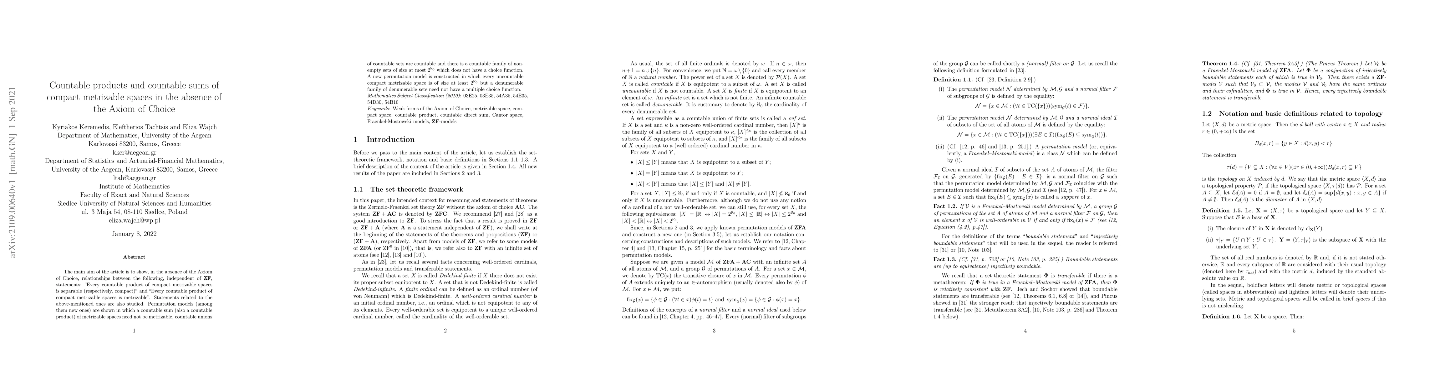 This paper explores relationships between separability, compactness, and metrizability of countable products of compact metrizable spaces without assuming the Axiom of Choice. It constructs permutation models demonstrating scenarios where countable sums of metrizable spaces fail to be metrizable, while countable unions of countable sets remain countable.