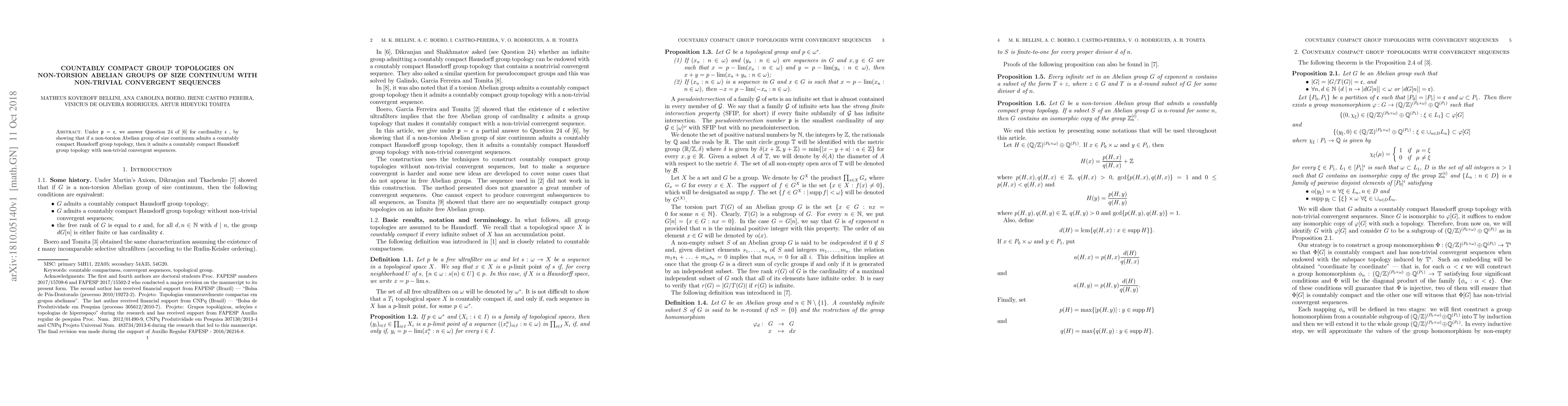This paper demonstrates that under the continuum hypothesis ($\mathfrak{p} = \mathfrak{c}$), a non-torsion Abelian group of size continuum, if it supports a countably compact Hausdorff group topology, must also support a countably compact Hausdorff group topology featuring non-trivial convergent sequences.