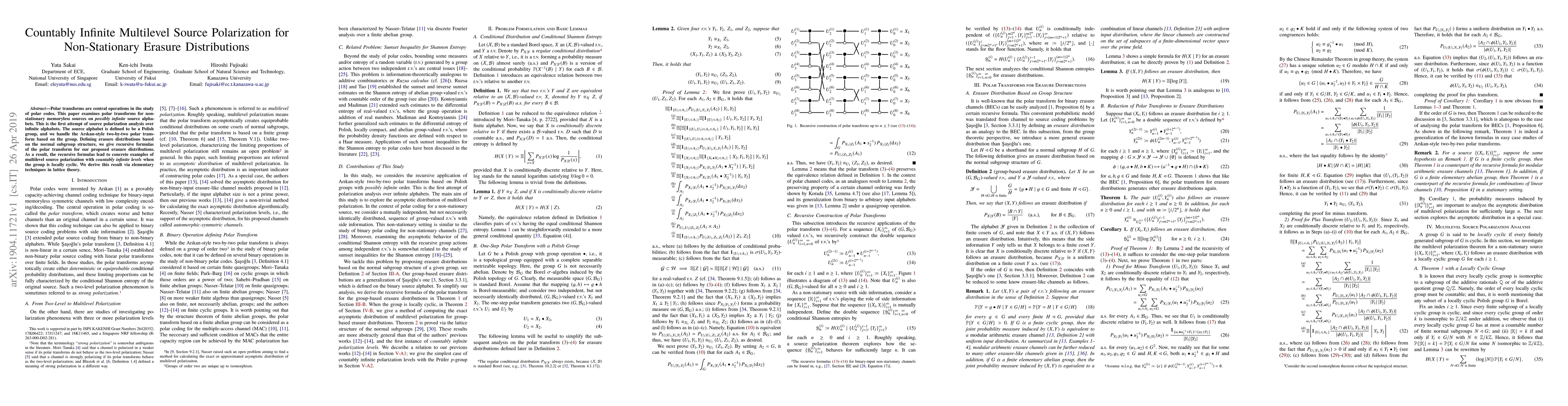 Polar transforms are central operations in the study of polar codes. This paper examines polar transforms for non-stationary memoryless sources on possibly infinite source alphabets. This is the first attempt of source polarization analysis over infinite alphabets. The source alphabet is defined to be a Polish group, and we handle the Ar{\i}kan-style two-by-two polar transform based on the group. Defining erasure distributions based on the normal subgroup structure, we give recursive formulas of the polar transform for our proposed erasure distributions. As a result, the recursive formulas lead to concrete examples of multilevel source polarization with countably infinite levels when the group is locally cyclic. We derive this result via elementary techniques in lattice theory.