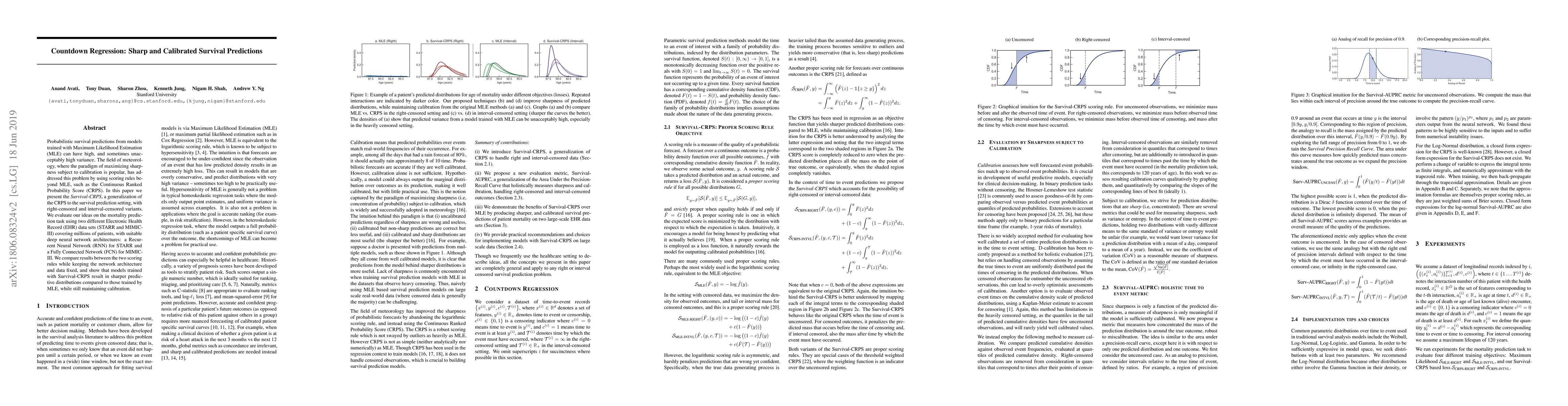 Probabilistic survival predictions from models trained with Maximum Likelihood Estimation (MLE) can have high, and sometimes unacceptably high variance. The field of meteorology, where the paradigm of maximizing sharpness subject to calibration is popular, has addressed this problem by using scoring rules beyond MLE, such as the Continuous Ranked Probability Score (CRPS). In this paper we present the \emph{Survival-CRPS}, a generalization of the CRPS to the survival prediction setting, with right-censored and interval-censored variants. We evaluate our ideas on the mortality prediction task using two different Electronic Health Record (EHR) data sets (STARR and MIMIC-III) covering millions of patients, with suitable deep neural network architectures: a Recurrent Neural Network (RNN) for STARR and a Fully Connected Network (FCN) for MIMIC-III. We compare results between the two scoring rules while keeping the network architecture and data fixed, and show that models trained with Survival-CRPS result in sharper predictive distributions compared to those trained by MLE, while still maintaining calibration.