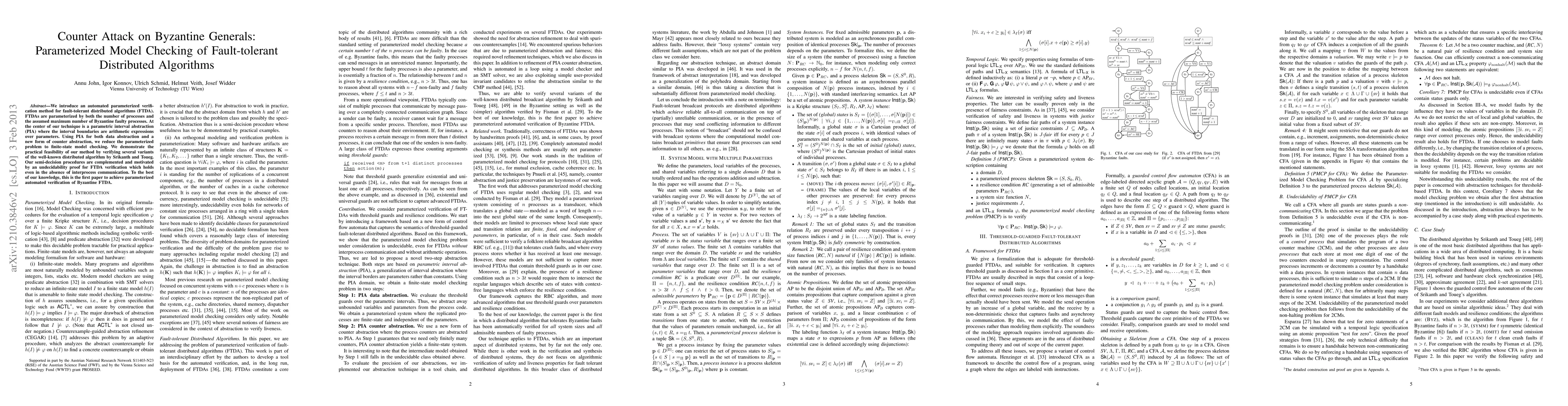 We introduce an automated parameterized verification method for fault-tolerant distributed algorithms (FTDA). FTDAs are parameterized by both the number of processes and the assumed maximum number of Byzantine faulty processes. At the center of our technique is a parametric interval abstraction (PIA) where the interval boundaries are arithmetic expressions over parameters. Using PIA for both data abstraction and a new form of counter abstraction, we reduce the parameterized problem to finite-state model checking. We demonstrate the practical feasibility of our method by verifying several variants of the well-known distributed algorithm by Srikanth and Toueg. Our semi-decision procedures are complemented and motivated by an undecidability proof for FTDA verification which holds even in the absence of interprocess communication. To the best of our knowledge, this is the first paper to achieve parameterized automated verification of Byzantine FTDA.