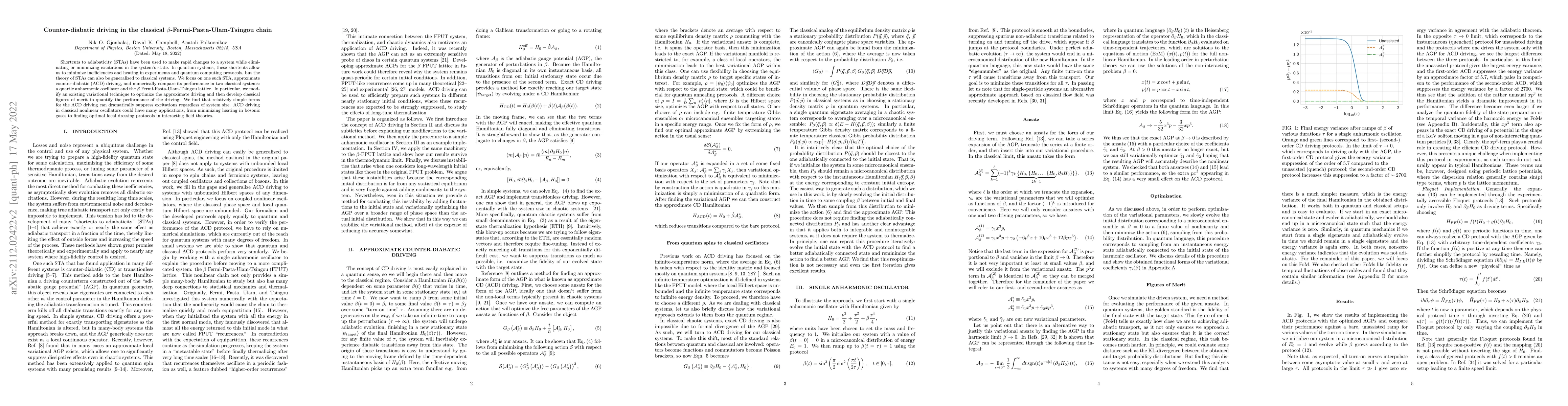 This paper explores the application of approximate counter-diabatic driving to classical systems, specifically the $\beta$-Fermi-Pasta-Ulam-Tsingou (FPUT) lattice, to minimize excitations and heating. The authors optimize the driving using a modified variational technique and develop classical figures of merit to quantify performance, demonstrating significant suppression of excitations.