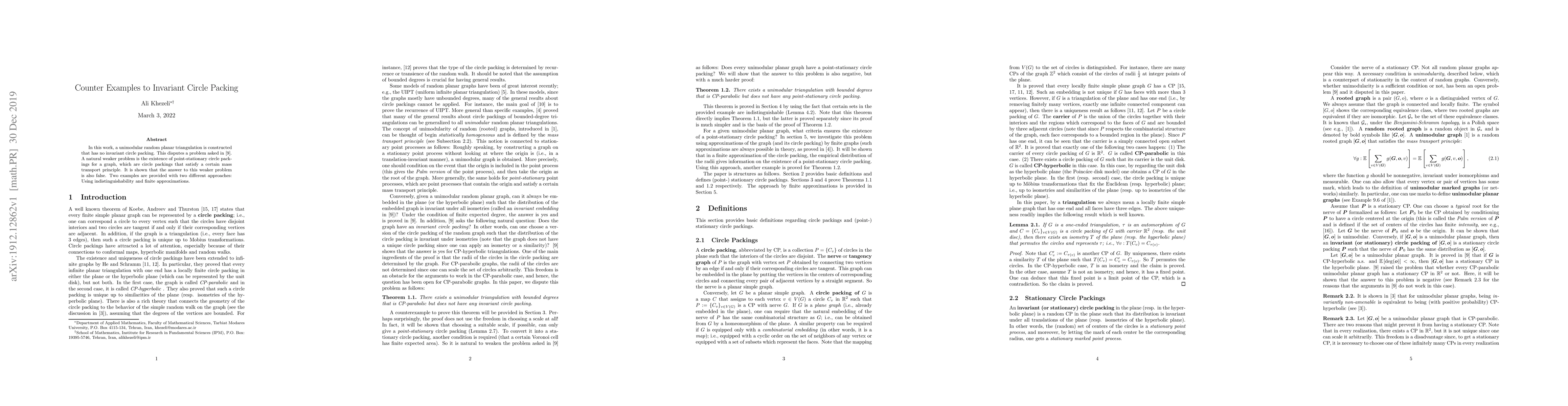 This paper constructs a unimodular random planar triangulation without an invariant circle packing, refuting a conjecture from [arXiv:1910.01614]. It also disproves the existence of point-stationary circle packings for a graph, using indistinguishability and finite approximations.