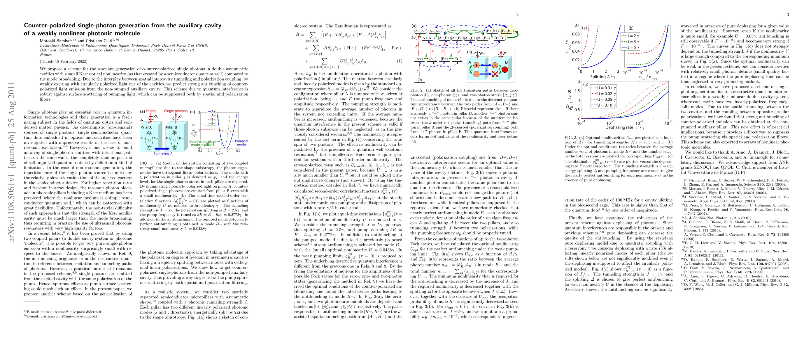 We propose a scheme for the resonant generation of counter-polarized single photons in double asymmetric cavities with a small Kerr optical nonlinearity (as that created by a semiconductor quantum well) compared to the mode broadening. Due to the interplay between spatial intercavity tunneling and polarization coupling, by weakly exciting with circularly polarized light one of the cavities, we predict strong antibunching of counter-polarized light emission from the non-pumped auxiliary cavity. This scheme due to quantum interference is robust against surface scattering of pumping light, which can be suppressed both by spatial and polarization filters.
