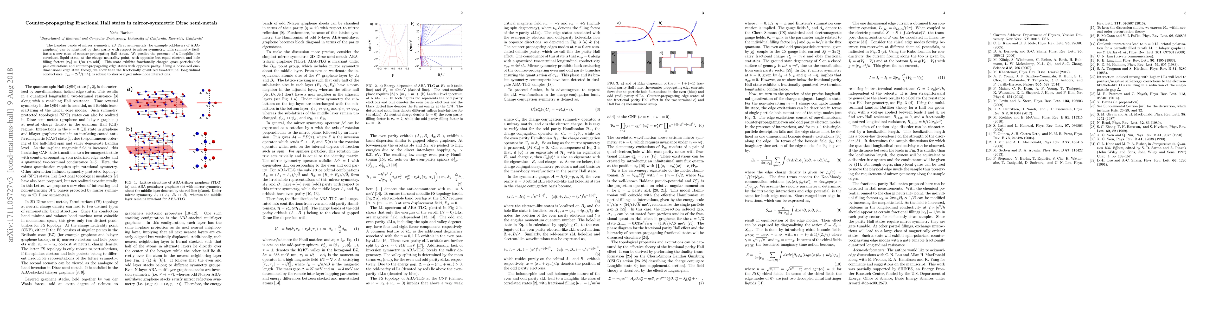 The Landau bands of mirror symmetric 2D Dirac semi-metals (for example odd-layers of ABA-graphene) can be identified by their parity with respect to mirror symmetry. This symmetry facilitates a new class of counter-propagating Hall states at opposite but equal electron and hole filling factors $|\nu_{\pm}|=1/m$ ({\it m} odd). Here, we propose a Laughlin-like correlated liquid wavefunction, at the charge neutrality point, that exhibits fractionally charged quasi-particle/hole pair excitation of opposite parity. Using a bosonized one-dimensional edge state theory, we show that the longitudinal conductance of this state, $\sigma_{xx} = 2e^2/(m h)$, is robust to short-ranged inter-mode interactions.
