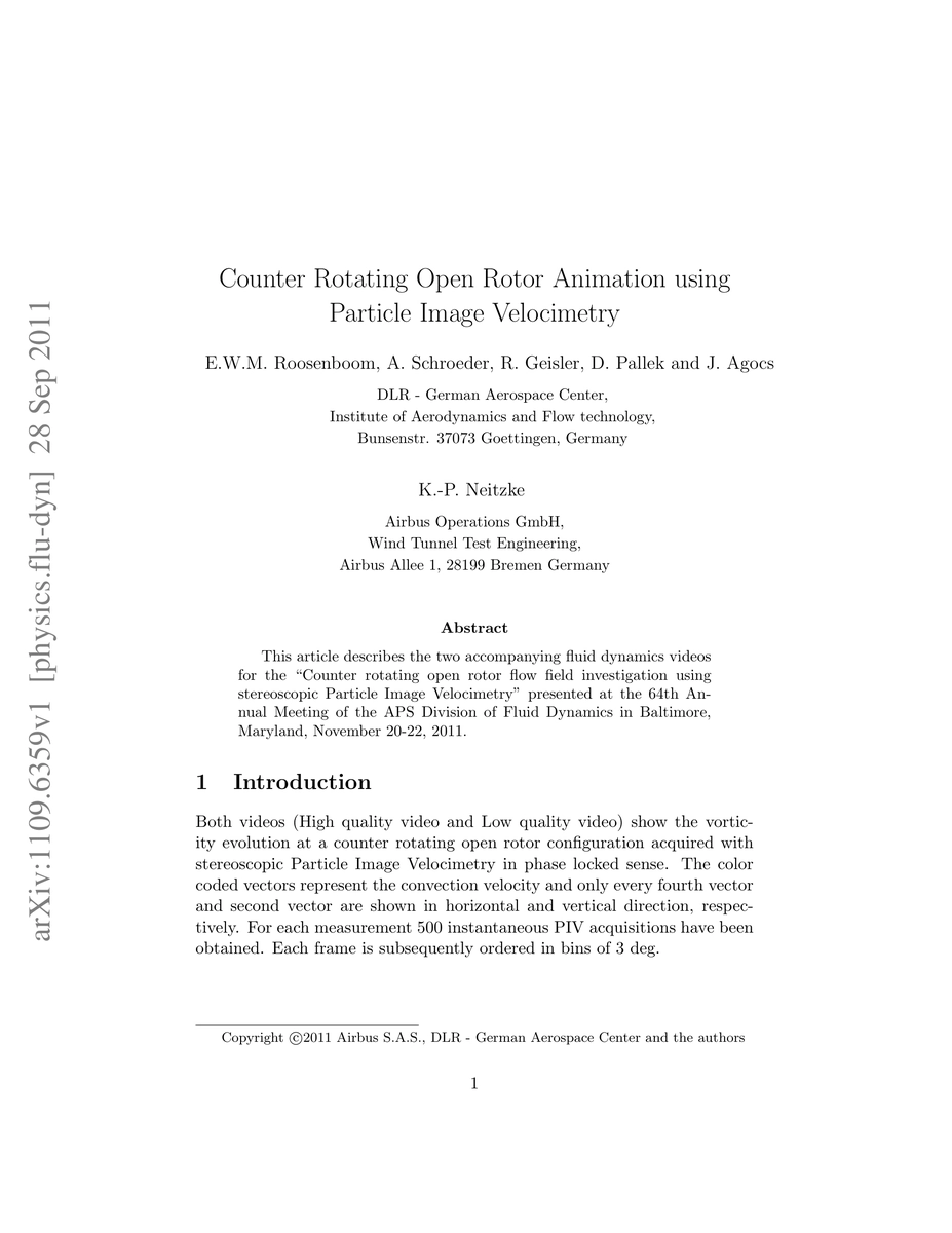 This research presents stereoscopic Particle Image Velocimetry to investigate the fluid dynamics of counter rotating open rotors, with accompanying videos demonstrating the flow field analysis. The study was showcased at the 64th Annual Meeting of the APS Division of Fluid Dynamics in 2011.