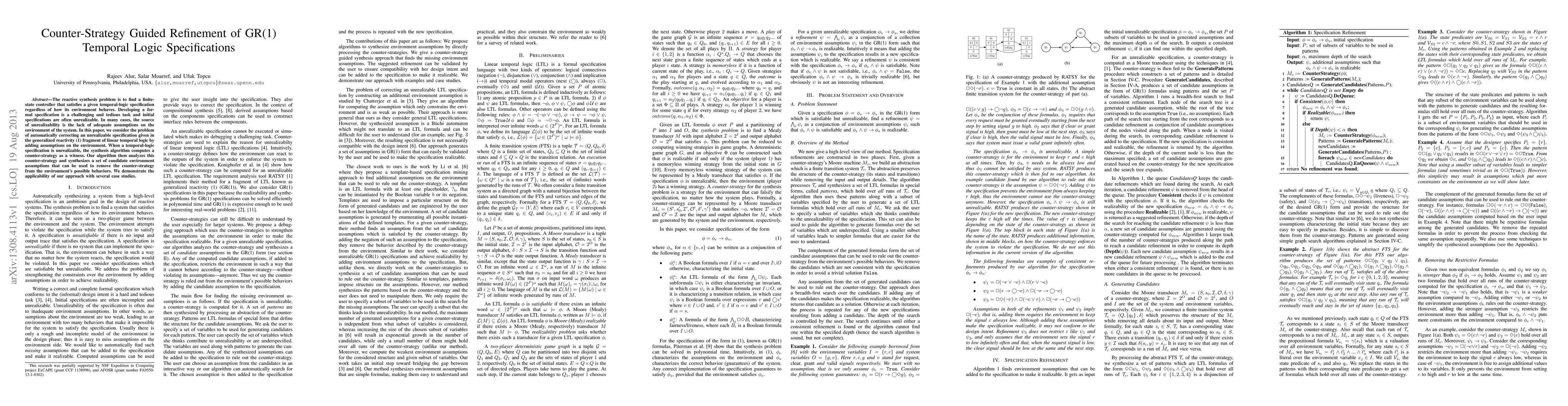 This paper proposes an algorithm to refine unrealizable GR(1) temporal logic specifications by automatically generating counter-strategies and synthesizing environment assumptions to correct the specification. The method demonstrates effectiveness through various case studies.