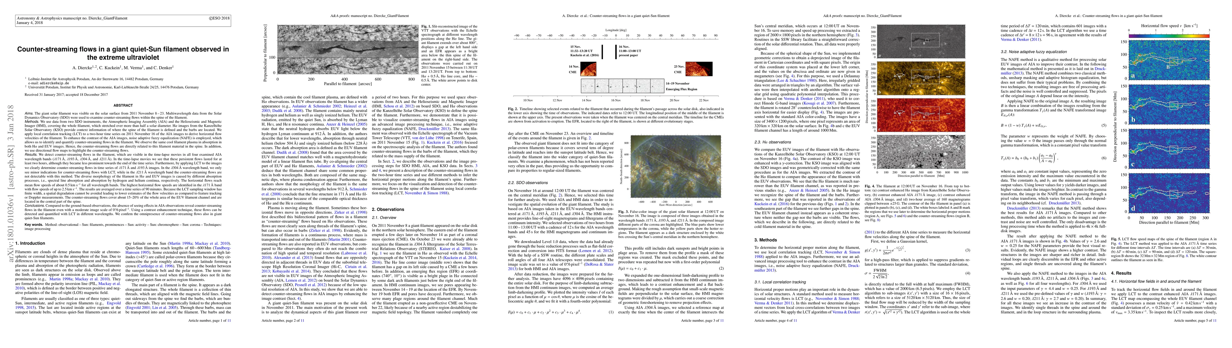 A giant solar filament was visible on the solar surface from 2011 Nov. 8-23. The filament stretched over more than half a solar diameter. Multiwavelength data from the SDO instrument AIA (171, 193, 304, and 211\AA) were used to examine counter-streaming flows within the spine of the filament. H$\alpha$ images from the Kanzelh\"ohe Solar Observatory provided context information. We apply local correlation tracking (LCT) to a two-hour time series on 2011 Nov. 16 of the AIA images to derive horizontal flow velocities of the filament. To enhance the contrast of the AIA images, noise adaptive fuzzy equalization is employed, which allows us to identify and quantify counter-streaming flows in the filament. We detect counter-streaming flows in the filament, which are visible in the time-lapse movies in all examined AIA wavelength bands. In the time-lapse movies we see that these persistent flows lasted for at least two hours. Furthermore, by applying LCT to the images we clearly determine counter-streaming flows in time series of 171 and 193\AA\ images. In the 304\AA\ wavelength band, we only see minor indications for counter-streaming flows with LCT, while in the 211\AA\ wavelength band the counter-streaming flows are not detectable. The average horizontal flows reach mean flow speeds of 0.5 km/s. The highest horizontal flow speeds are identified in the 171\AA\ band with flow speeds of up to 2.5 km/s. The results are averaged over a time series of 90 min. Because the LCT sampling window has finite width, a spatial degradation cannot be avoided leading to lower estimates of the flow velocities as compared to feature tracking or Doppler measurements. The counter-streaming flows cover about 15-20% of the whole area of the EUV filament channel and are located in the central part of the spine. In conclusion, we confirm the omnipresence of counter-streaming flows also in giant quiet-Sun filaments.