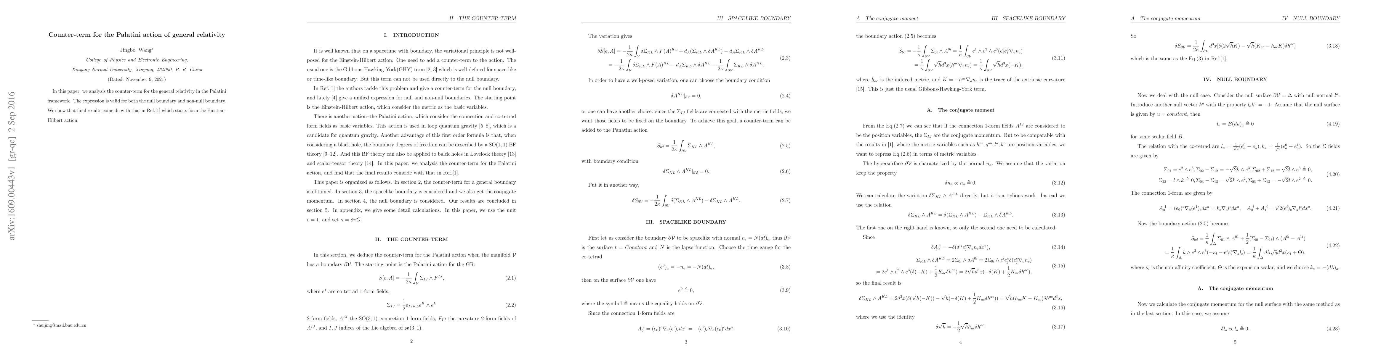 This paper analyzes the counter-term for general relativity within the Palatini framework, demonstrating its validity for both null and non-null boundaries. The results align with those obtained from the Einstein-Hilbert action, as shown in Ref.\cite{pad1}.