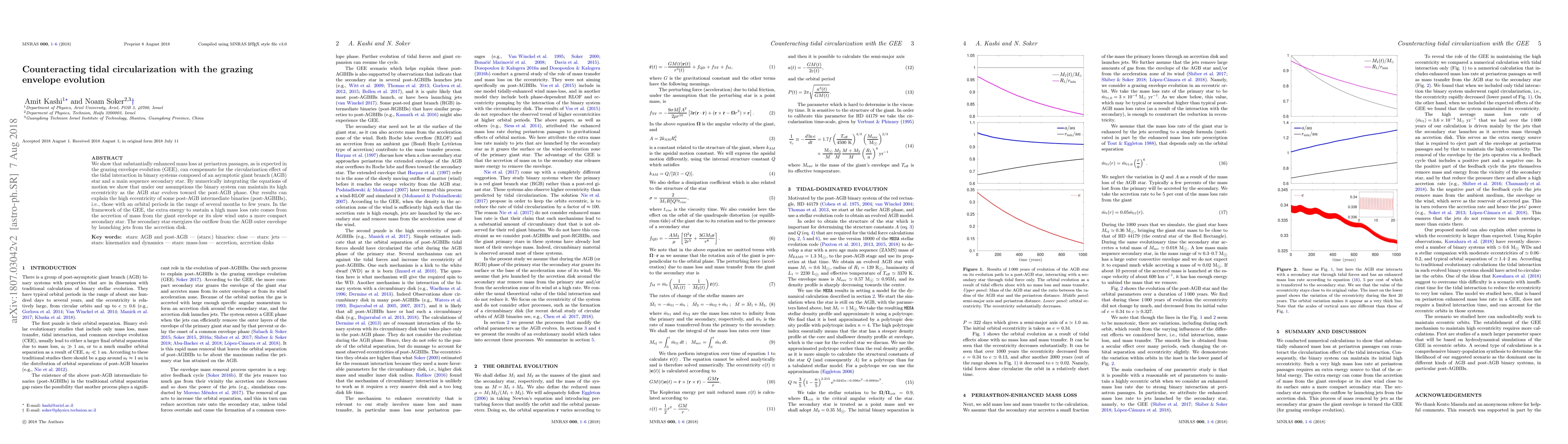 We show that substantially enhanced mass loss at periastron passages, as is expected in the grazing envelope evolution (GEE), can compensate for the circularization effect of the tidal interaction in binary systems composed of an asymptotic giant branch (AGB) star and a main sequence secondary star. By numerically integrating the equations of motion we show that under our assumptions the binary system can maintain its high eccentricity as the AGB star evolves toward the post-AGB phase. Our results can explain the high eccentricity of some post-AGB intermediate binaries (post-AGBIBs), i.e., those with an orbital periods in the range of several months to few years. In the framework of the GEE, the extra energy to sustain a high mass loss rate comes from the accretion of mass from the giant envelope or its slow wind onto a more compact secondary star. The secondary star energizes the outflow from the AGB outer envelope by launching jets from the accretion disk.