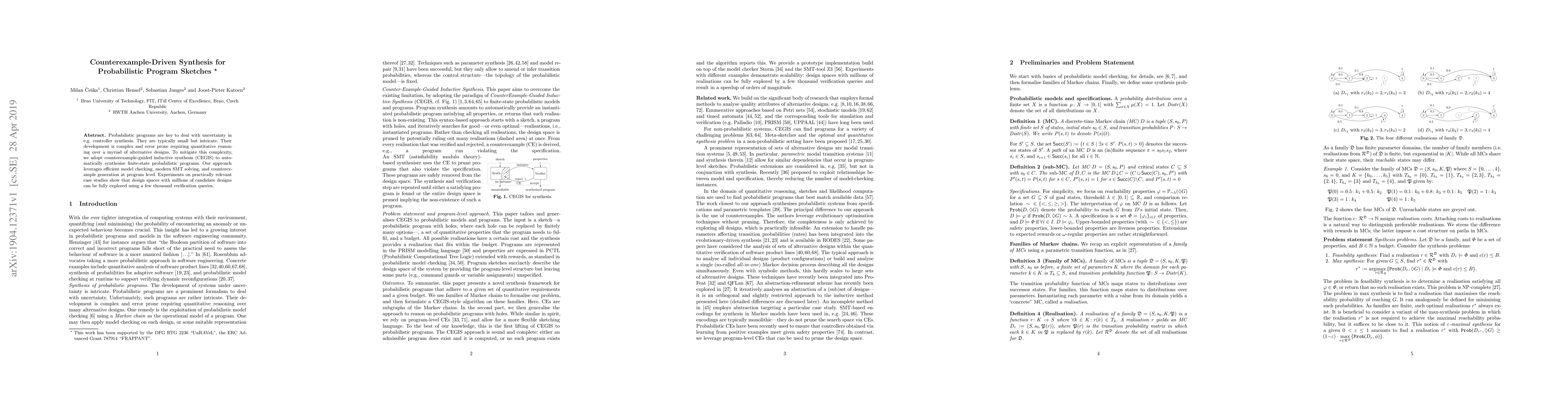This paper proposes a counterexample-driven synthesis method for creating finite-state probabilistic programs, utilizing CEGIS, efficient model checking, and SMT solving to explore vast design spaces with minimal verification queries. Experimental results demonstrate the effectiveness of the approach in practical scenarios.