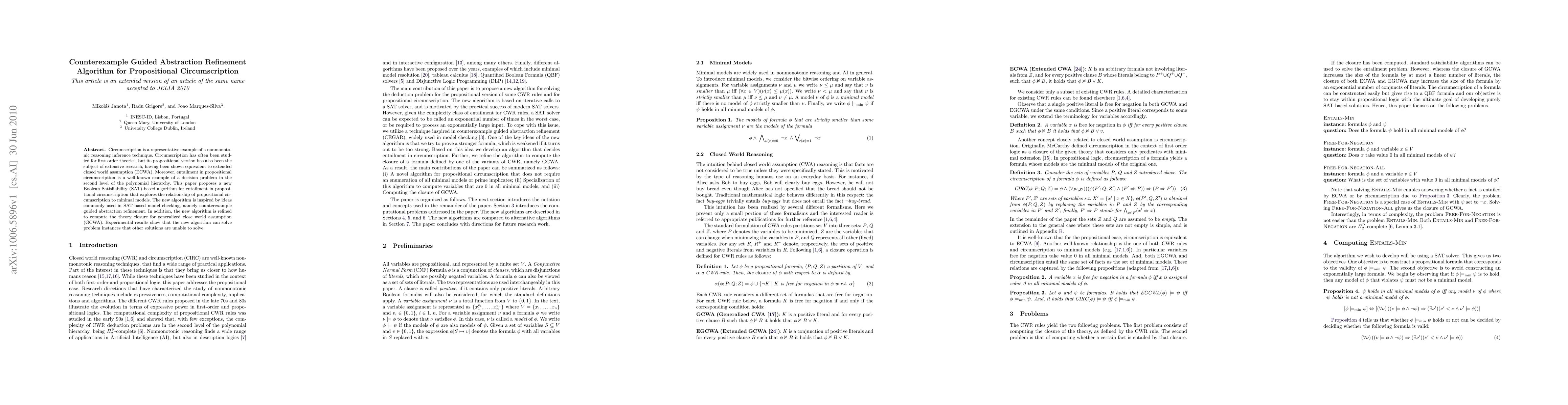 Circumscription is a representative example of a nonmonotonic reasoning inference technique. Circumscription has often been studied for first order theories, but its propositional version has also been the subject of extensive research, having been shown equivalent to extended closed world assumption (ECWA). Moreover, entailment in propositional circumscription is a well-known example of a decision problem in the second level of the polynomial hierarchy. This paper proposes a new Boolean Satisfiability (SAT)-based algorithm for entailment in propositional circumscription that explores the relationship of propositional circumscription to minimal models. The new algorithm is inspired by ideas commonly used in SAT-based model checking, namely counterexample guided abstraction refinement. In addition, the new algorithm is refined to compute the theory closure for generalized close world assumption (GCWA). Experimental results show that the new algorithm can solve problem instances that other solutions are unable to solve.