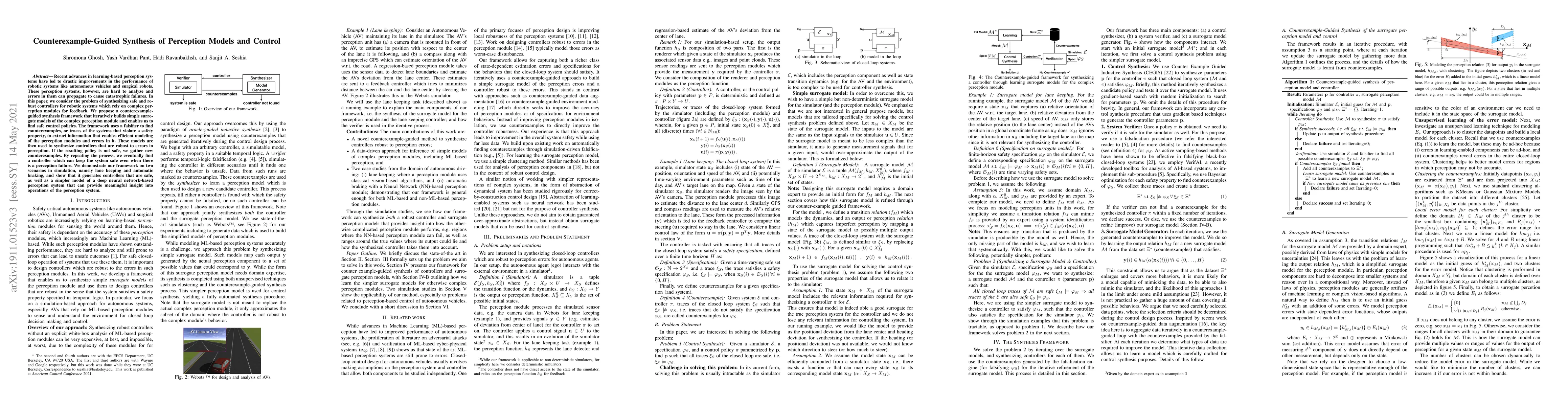 Recent advances in learning-based perception systems have led to drastic improvements in the performance of robotic systems like autonomous vehicles and surgical robots. These perception systems, however, are hard to analyze and errors in them can propagate to cause catastrophic failures. In this paper, we consider the problem of synthesizing safe and robust controllers for robotic systems which rely on complex perception modules for feedback. We propose a counterexample-guided synthesis framework that iteratively builds simple surrogate models of the complex perception module and enables us to find safe control policies. The framework uses a falsifier to find counterexamples, or traces of the systems that violate a safety property, to extract information that enables efficient modeling of the perception modules and errors in it. These models are then used to synthesize controllers that are robust to errors in perception. If the resulting policy is not safe, we gather new counterexamples. By repeating the process, we eventually find a controller which can keep the system safe even when there is a perception failure. We demonstrate our framework on two scenarios in simulation, namely lane keeping and automatic braking, and show that it generates controllers that are safe, as well as a simpler model of a deep neural network-based perception system that can provide meaningful insight into operations of the perception system.