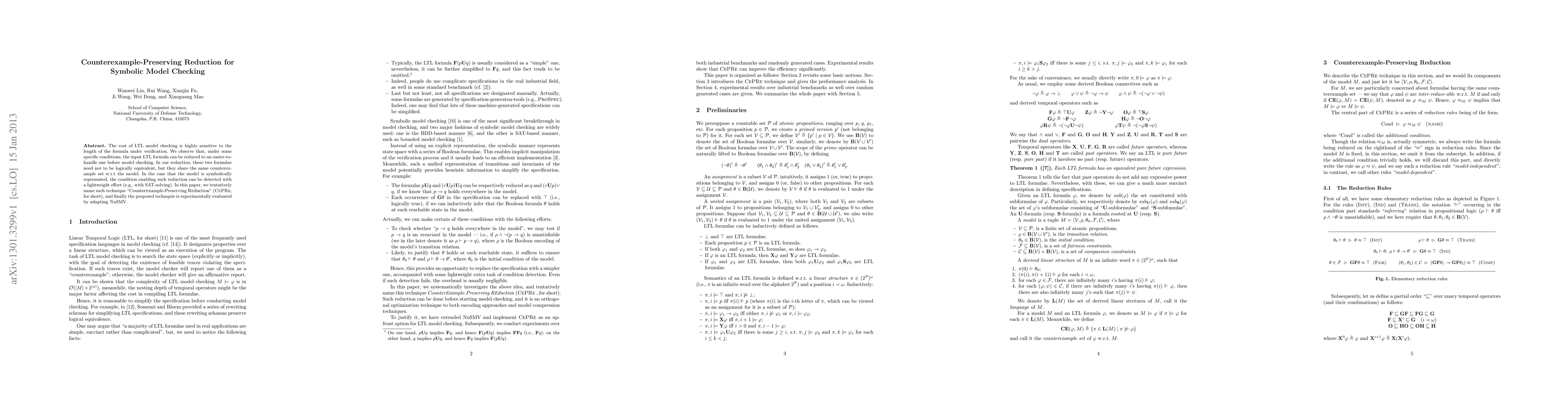 The cost of LTL model checking is highly sensitive to the length of the formula under verification. We observe that, under some specific conditions, the input LTL formula can be reduced to an easier-to-handle one before model checking. In our reduction, these two formulae need not to be logically equivalent, but they share the same counterexample set w.r.t the model. In the case that the model is symbolically represented, the condition enabling such reduction can be detected with a lightweight effort (e.g., with SAT-solving). In this paper, we tentatively name such technique "Counterexample-Preserving Reduction" (CePRe for short), and finally the proposed technquie is experimentally evaluated by adapting NuSMV.
