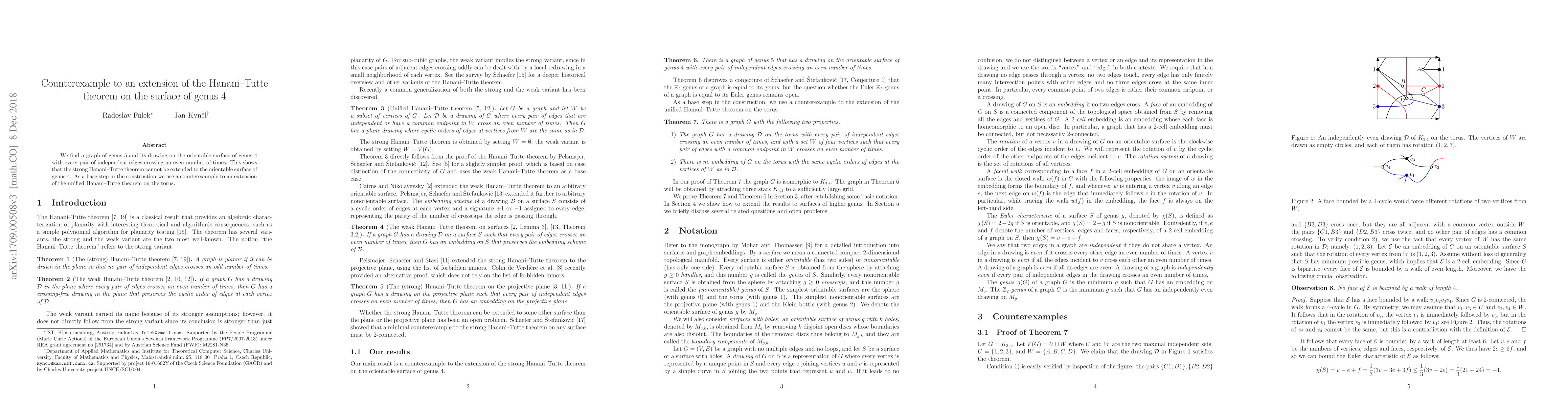 Summary: The paper presents a genus 5 graph drawn on a genus 4 surface where every pair of independent edges crosses an even number of times, disproving the extension of the Hanani-Tutte theorem to genus 4 surfaces. The construction leverages a counterexample from the torus.