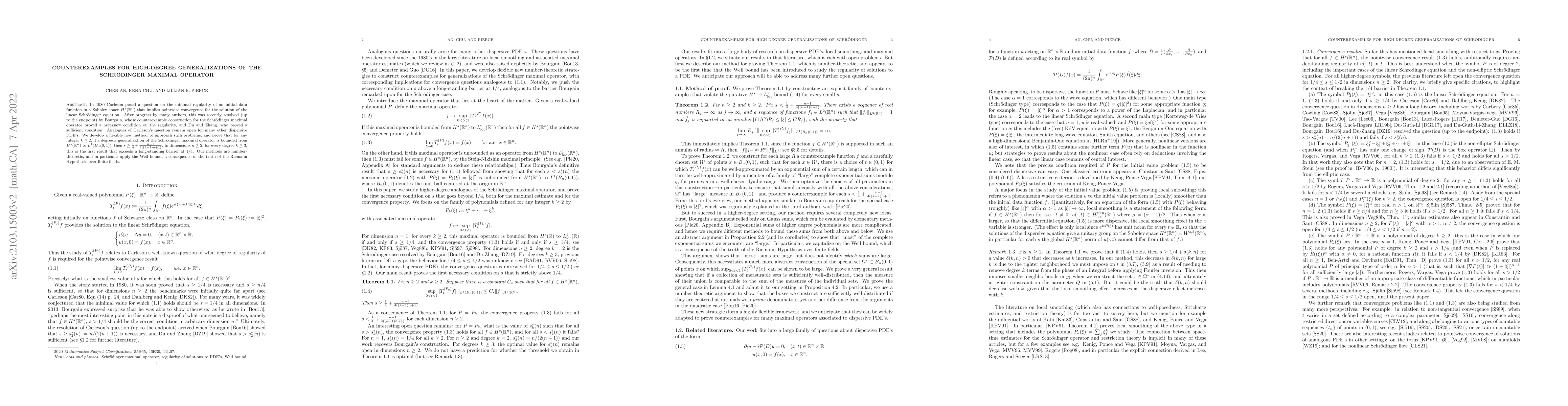This paper develops a new method to address high-degree generalizations of the Schrödinger maximal operator, proving that for any integer $k \geq 2$ and dimensions $n \geq 2$, a degree $k$ generalization must have regularity $s \geq \frac{1}{4} + \frac{n-1}{4((k-1)n+1)}$ to be bounded from $H^s(\mathbb{R}^n)$ to $L^1(B_n(0,1))$, surpassing a long-standing barrier at $1/4$ for $k \geq 3$. The approach leverages number-theoretic techniques, including the Weil bound.