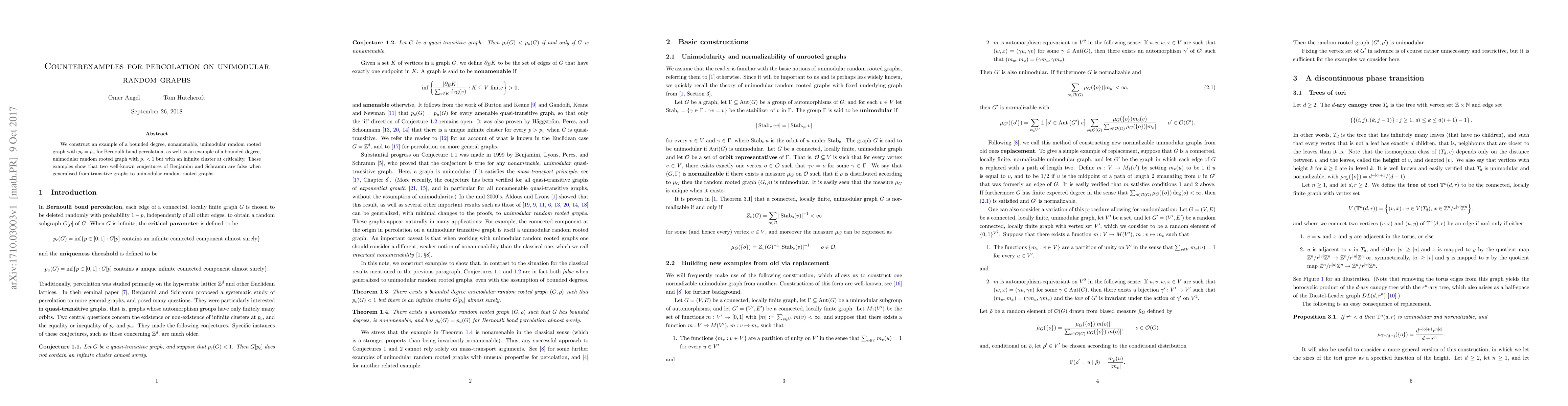 We construct an example of a bounded degree, nonamenable, unimodular random rooted graph with $p_c=p_u$ for Bernoulli bond percolation, as well as an example of a bounded degree, unimodular random rooted graph with $p_c<1$ but with an infinite cluster at criticality. These examples show that two well-known conjectures of Benjamini and Schramm are false when generalised from transitive graphs to unimodular random rooted graphs.