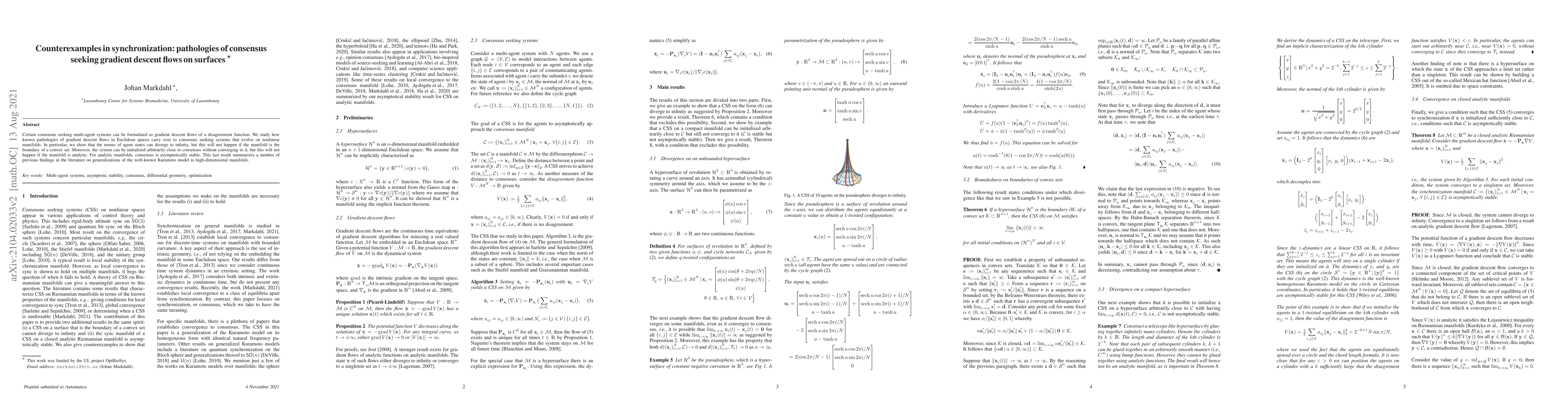 Certain consensus seeking multi-agent systems can be formulated as gradient descent flows of a disagreement function. We study how known pathologies of gradient descent flows in Euclidean spaces carry over to consensus seeking systems that evolve on nonlinear manifolds. In particular, we show that the norms of agent states can diverge to infinity, but this will not happen if the manifold is the boundary of a convex set. Moreover, the system can be initialized arbitrarily close to consensus without converging to it, but this will not happen if the manifold is analytic. For analytic manifolds, consensus is asymptotically stable. This last result summarizes a number of previous findings in the literature on generalizations of the well-known Kuramoto model to high-dimensional manifolds.