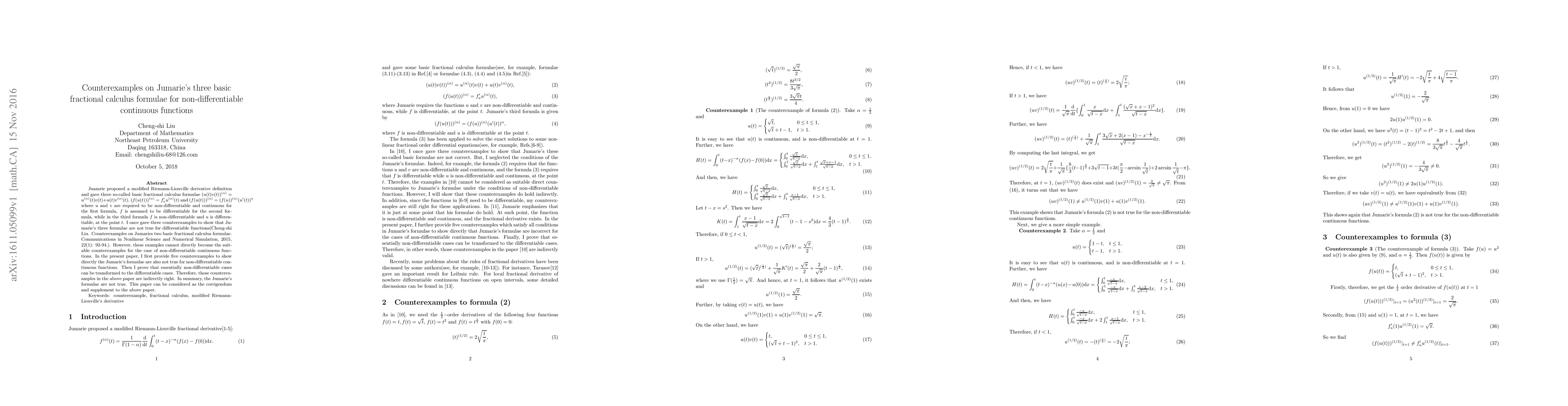 Summary: This paper presents five counterexamples demonstrating that Jumarie's three basic fractional calculus formulae do not hold for non-differentiable continuous functions. The findings challenge the validity of these formulae in such contexts.