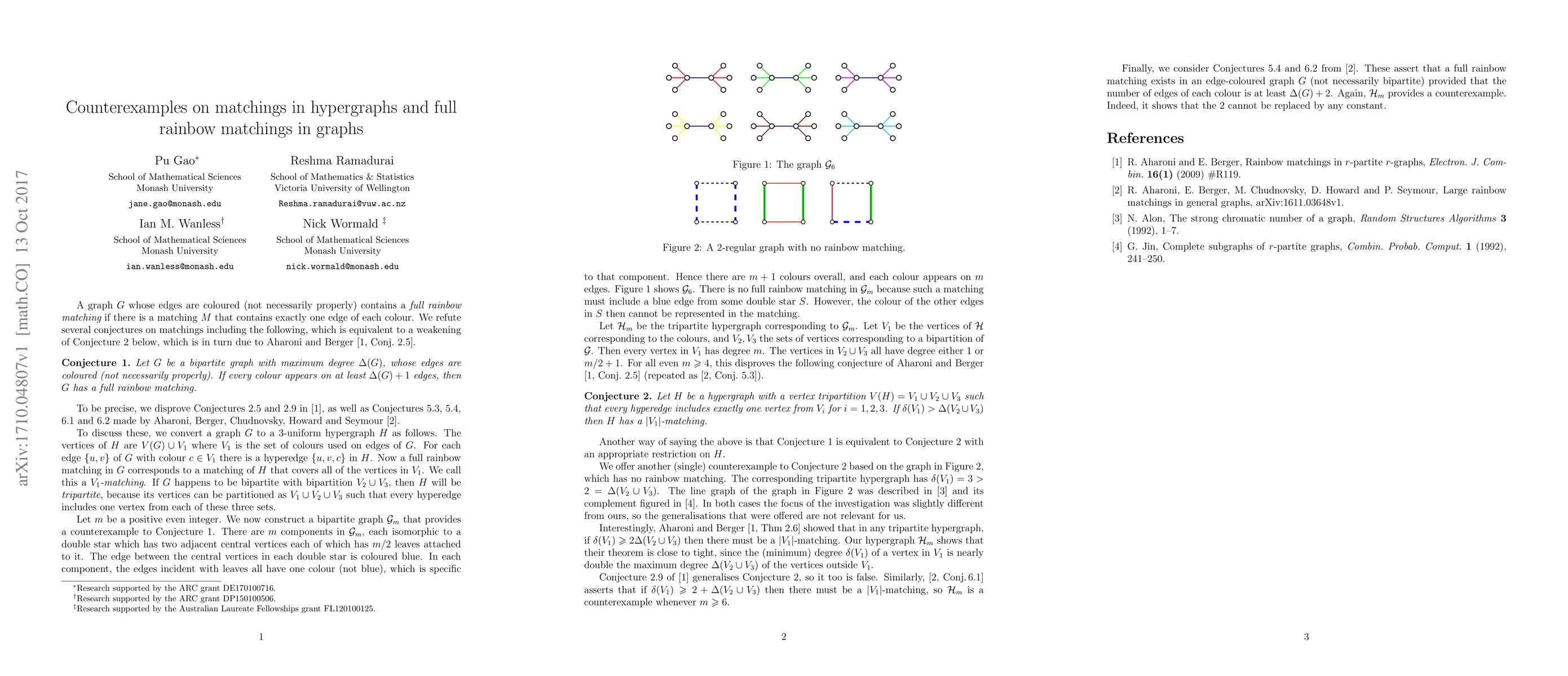 The paper refutes several conjectures on matchings in hypergraphs and full rainbow matchings in graphs, finding counterexamples to challenges made by Aharoni and Berger.