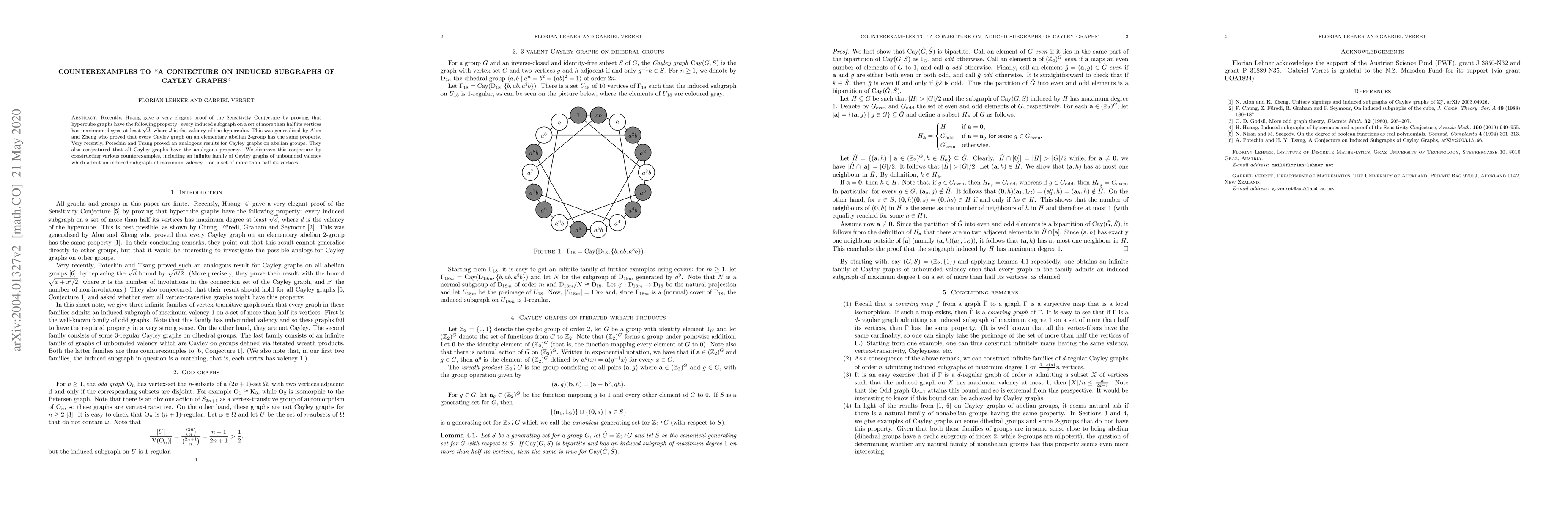 Recently, Huang gave a very elegant proof of the Sensitivity Conjecture by proving that hypercube graphs have the following property: every induced subgraph on a set of more than half its vertices has maximum degree at least $\sqrt{d}$, where $d$ is the valency of the hypercube. This was generalised by Alon and Zheng who proved that every Cayley graph on an elementary abelian $2$-group has the same property. Very recently, Potechin and Tsang proved an analogous results for Cayley graphs on abelian groups. They also conjectured that all Cayley graphs have the analogous property. We disprove this conjecture by constructing various counterexamples, including an infinite family of Cayley graphs of unbounded valency which admit an induced subgraph of maximum valency $1$ on a set of more than half its vertices.