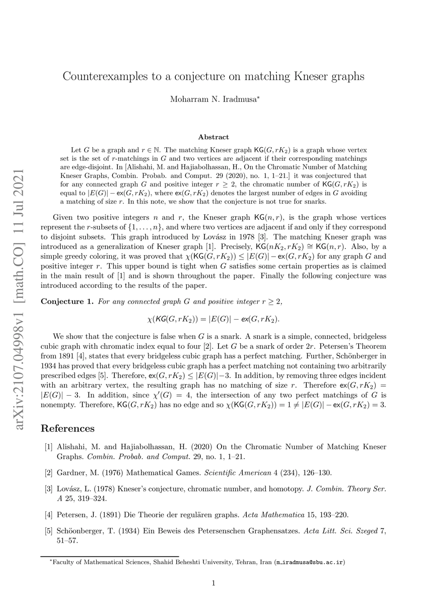 A research paper disproves a conjecture about matching Kneser graphs, specifically for snarks, showing that the chromatic number is not equal to |E(G)|- extsf{ex}(G,rK_2)| for positive integer r >= 2.