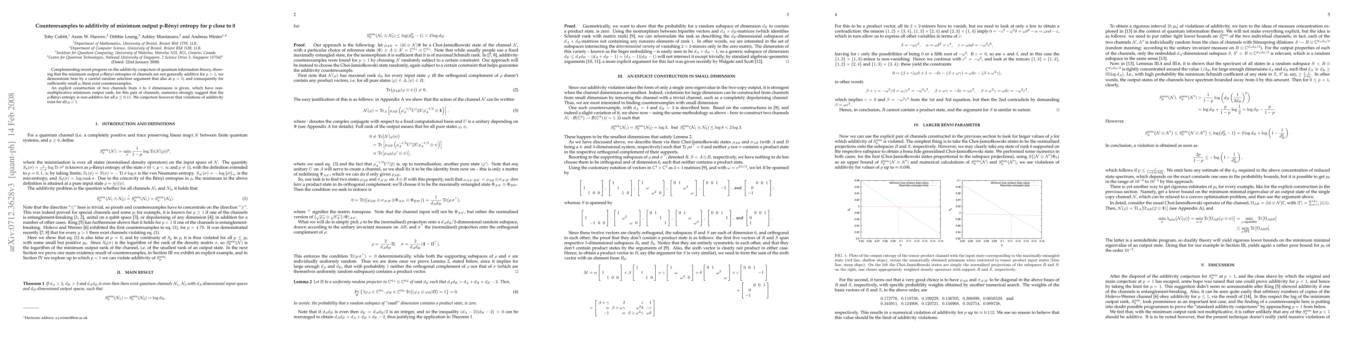 This paper presents counterexamples disproving the additivity of minimum output p-Rényi entropy for values of p near 0, showing that additivity fails not only for p>1 but also for sufficiently small p. An explicit construction of two quantum channels demonstrates non-additive behavior for p < 0.11.