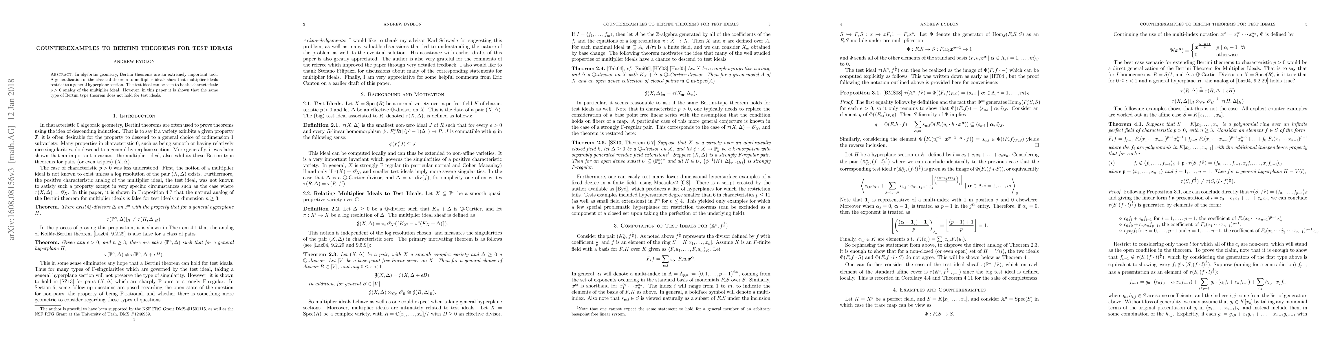 Summary: This paper demonstrates that in characteristic $p > 0$, the Bertini-type theorem does not apply to test ideals, which serve as the analog of multiplier ideals in positive characteristic. It presents counterexamples showing the failure of a generalized Bertini theorem for test ideals.