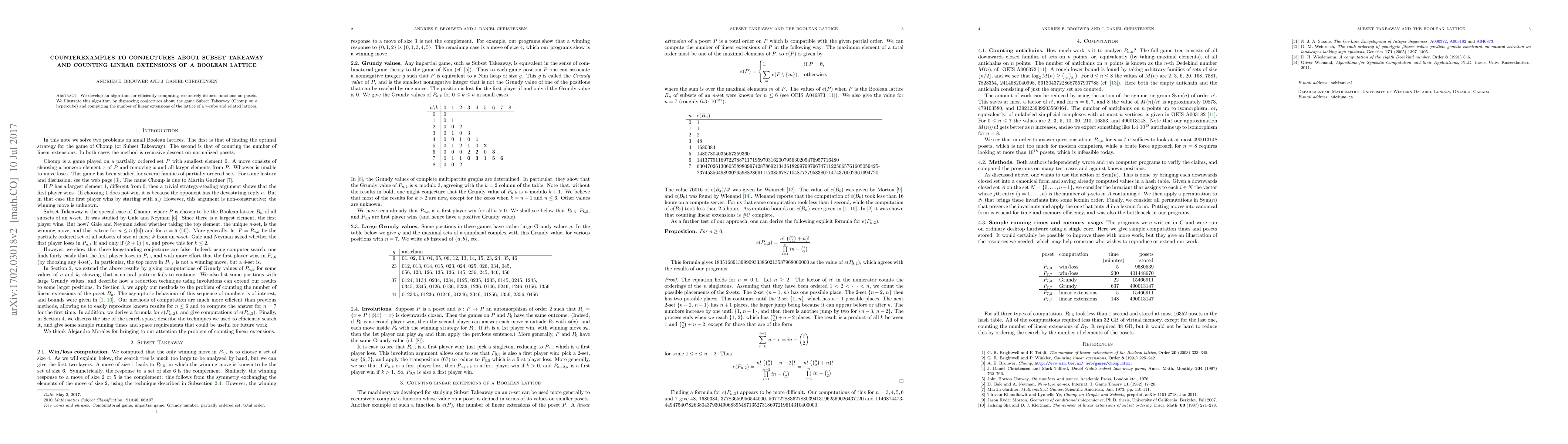 This paper presents an algorithm for computing recursively defined functions on posets and uses it to disprove conjectures about the Subset Takeaway game and to count the linear extensions of a 7-cube's lattice. The findings challenge existing assumptions and provide new insights into combinatorial structures.