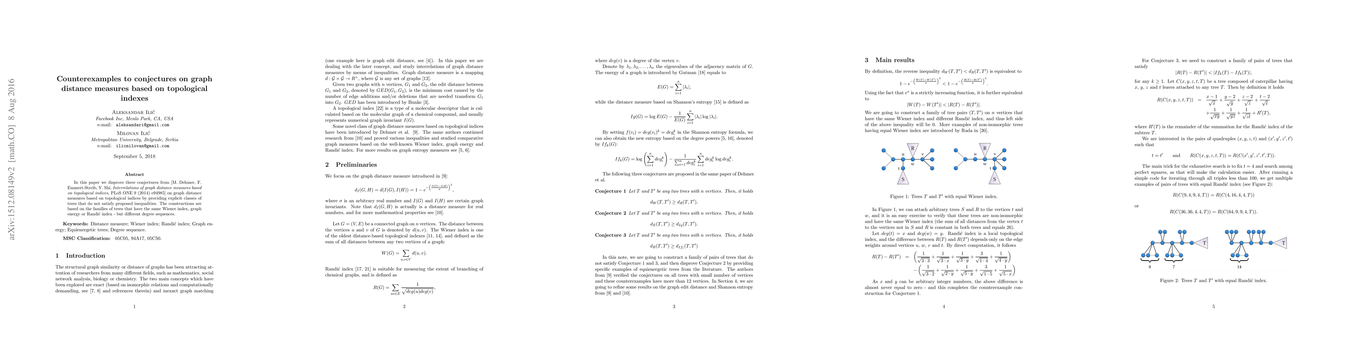 In this paper we disprove three conjectures from [M. Dehmer, F. Emmert-Streib, Y. Shi, Interrelations of graph distance measures based on topological indices, PLoS ONE 9 (2014) e94985] on graph distance measures based on topological indices by providing explicit classes of trees that do not satisfy proposed inequalities. The constructions are based on the families of trees that have the same Wiener index, graph energy or Randic index - but different degree sequences.