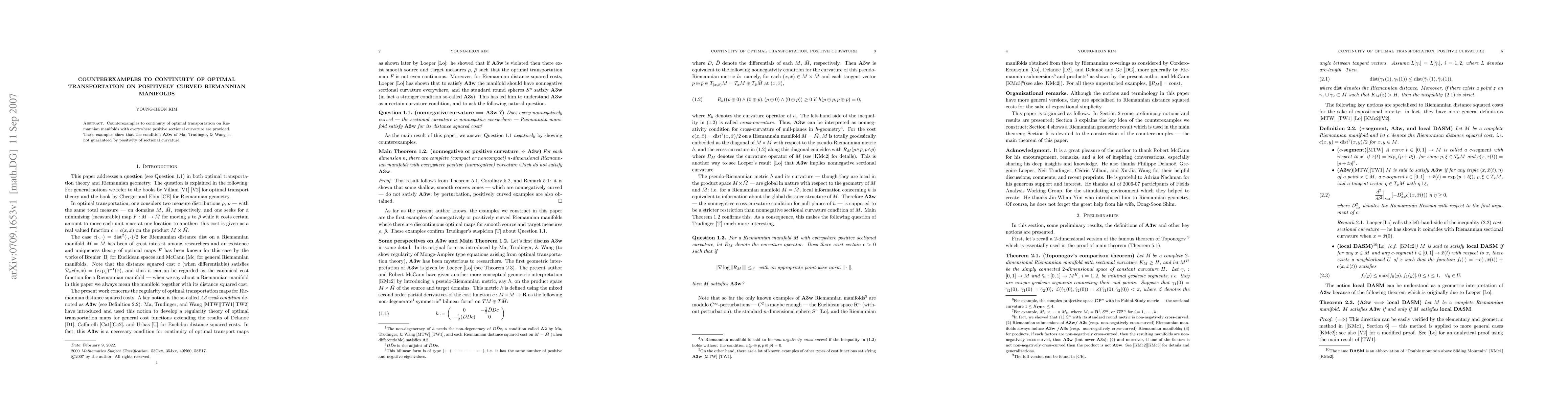 Summary: This paper presents counterexamples demonstrating that optimal transportation is not necessarily continuous on Riemannian manifolds with everywhere positive sectional curvature, refuting the assumption that condition A3w holds solely due to such curvature. The findings challenge the notion that positive sectional curvature guarantees the continuity of optimal transportation.