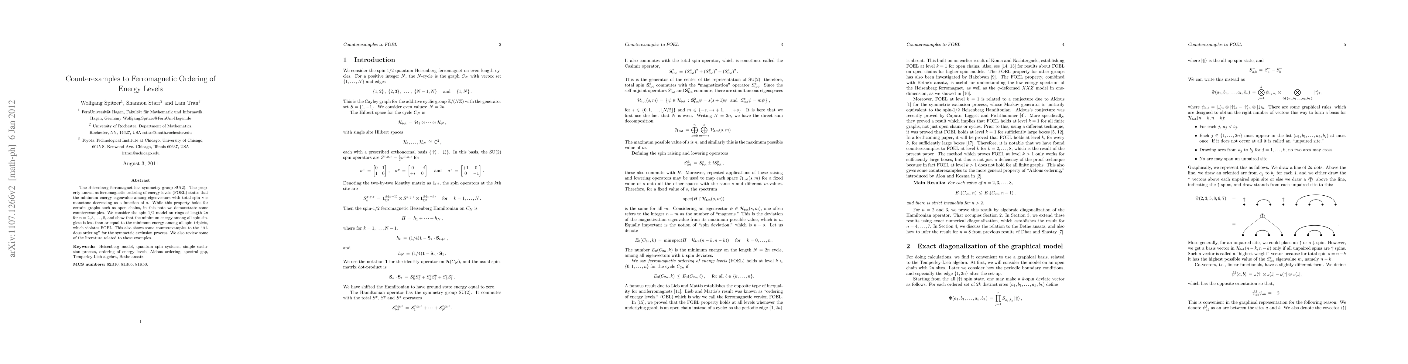 This paper demonstrates counterexamples to the ferromagnetic ordering of energy levels (FOEL) in spin 1/2 models on rings of length $2n$ for $n=2,3,...,8$, showing that the minimum energy among spin singlets is less than or equal to that among spin triplets, violating FOEL. It also presents counterexamples to Aldous ordering for the symmetric exclusion process.
