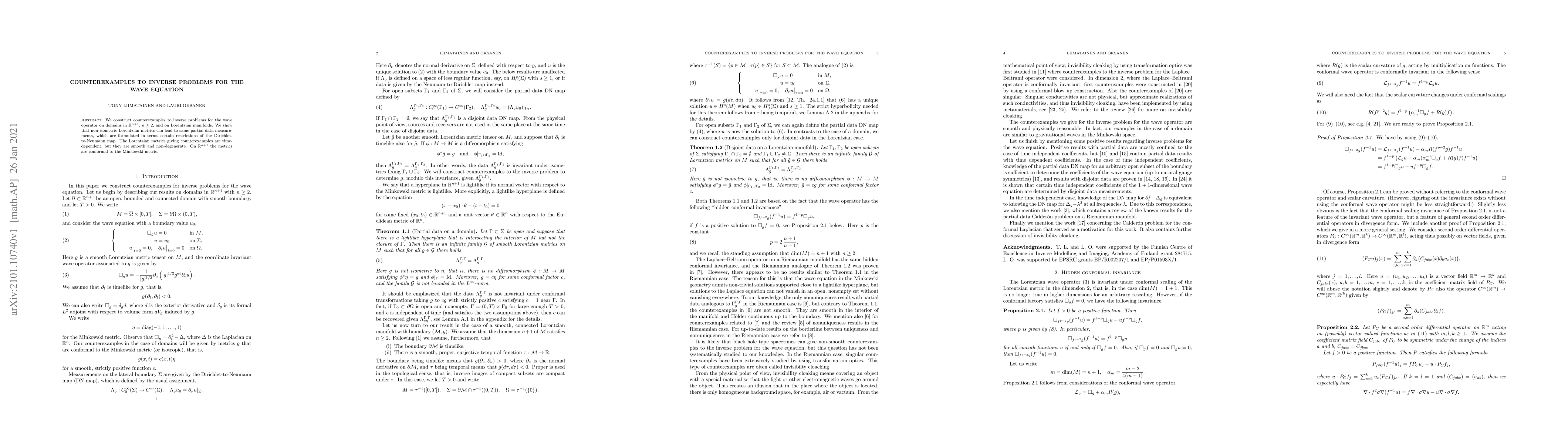 We construct counterexamples to inverse problems for the wave operator on domains in $\mathbb{R}^{n+1}$, $n \ge 2$, and on Lorentzian manifolds. We show that non-isometric Lorentzian metrics can lead to same partial data measurements, which are formulated in terms certain restrictions of the Dirichlet-to-Neumann map. The Lorentzian metrics giving counterexamples are time-dependent, but they are smooth and non-degenerate. On $\mathbb{R}^{n+1}$ the metrics are conformal to the Minkowski metric.