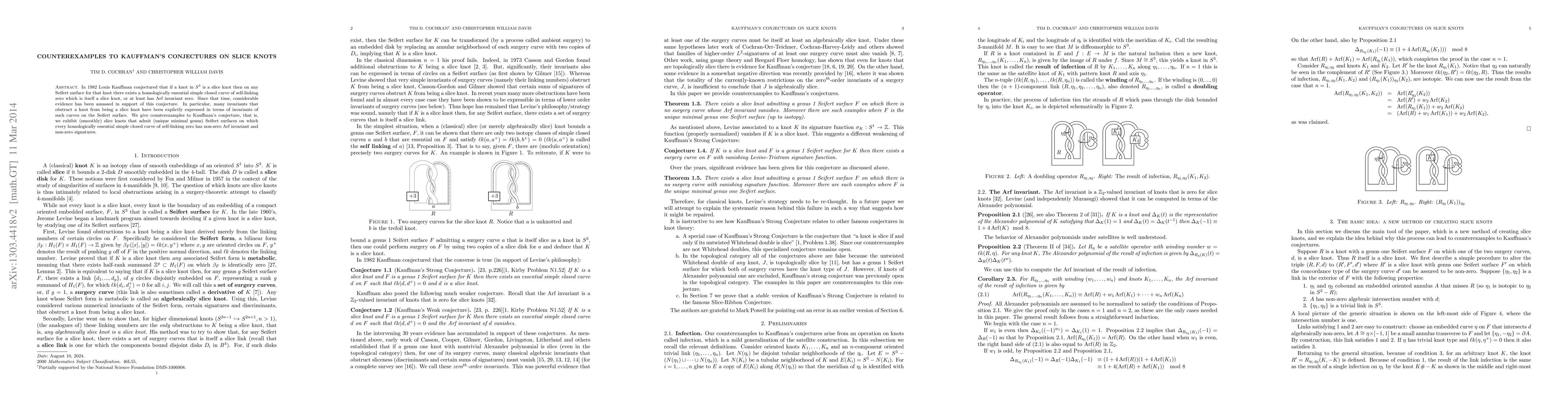 Research paper provides counterexamples to Louis Kauffman's conjecture on slice knots, showing that some slice knots have Seifert surfaces with curves of self-linking zero having non-zero Arf invariant and signatures.