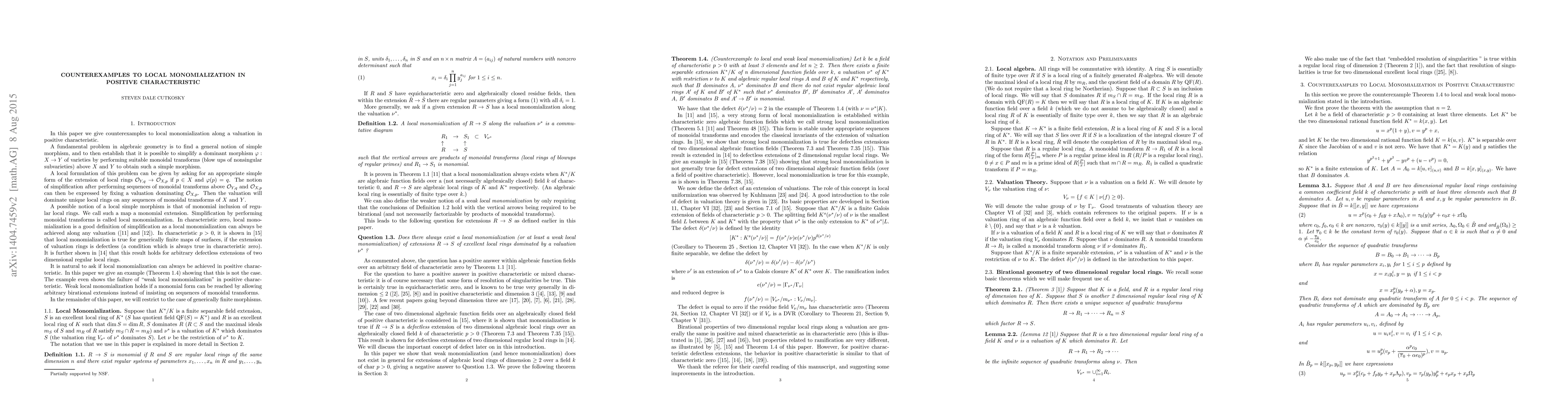 This paper presents a counterexample demonstrating that local monomialization does not hold for certain extensions of algebraic local rings in positive characteristic, contrasting with the characteristic zero case. The study focuses on birational properties and ramification in excellent local rings, particularly in function fields of dimension two or higher.
