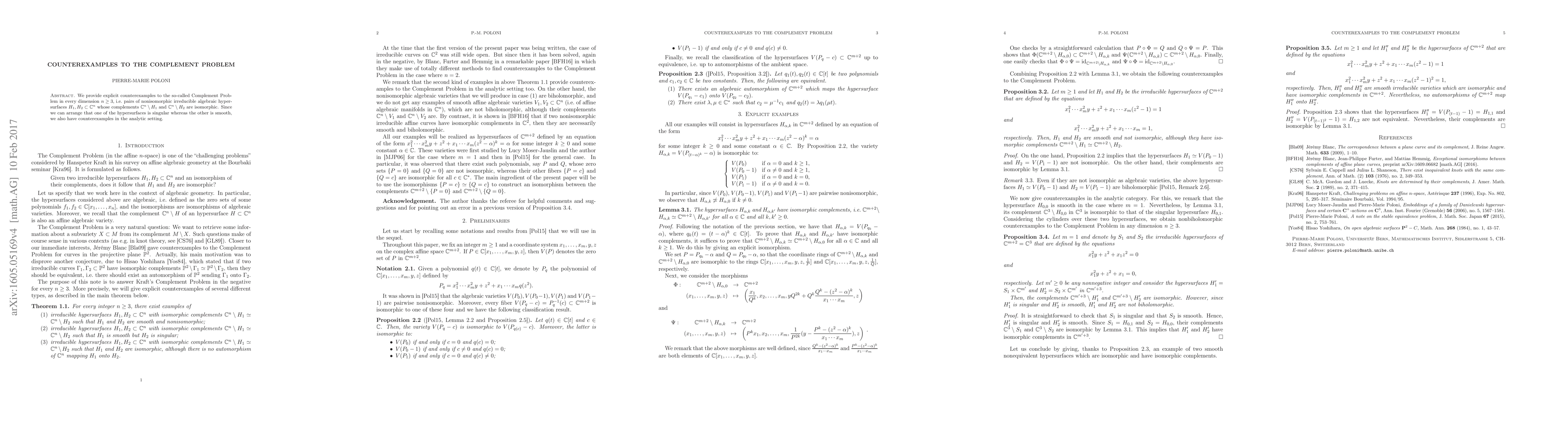 Researchers provide explicit counterexamples to the Complement Problem in every dimension n=3+, showing that pairs of non-isomorphic hypersurfaces have isomorphic complements.
