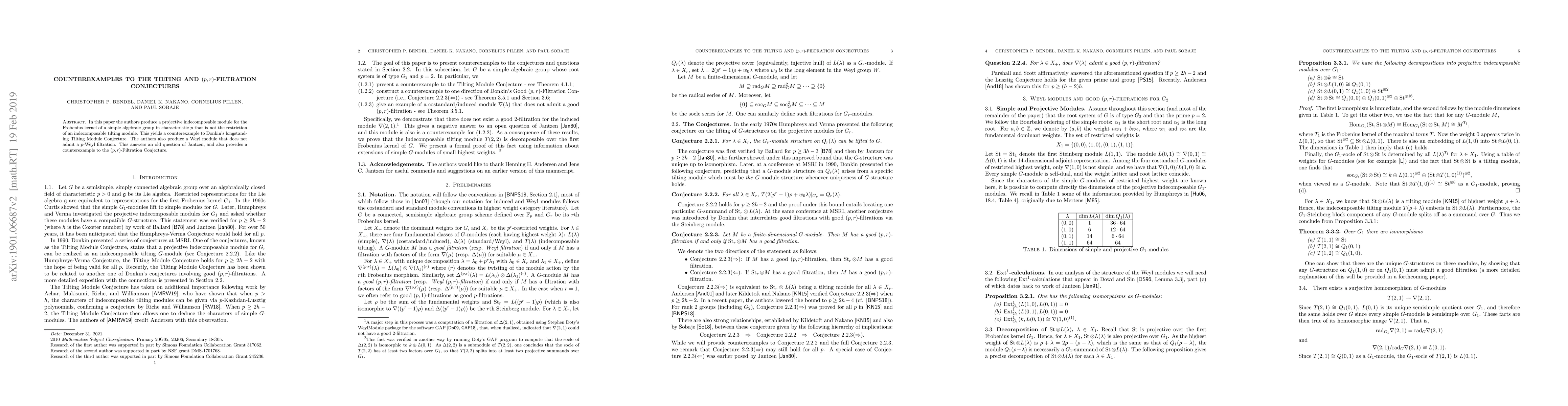 The paper provides counterexamples to two conjectures in representation theory, including Donkin's Tilting Module Conjecture and the $(p,r)$-Filtration Conjecture, by constructing a projective indecomposable module in characteristic $p$ that defies these conjectures.